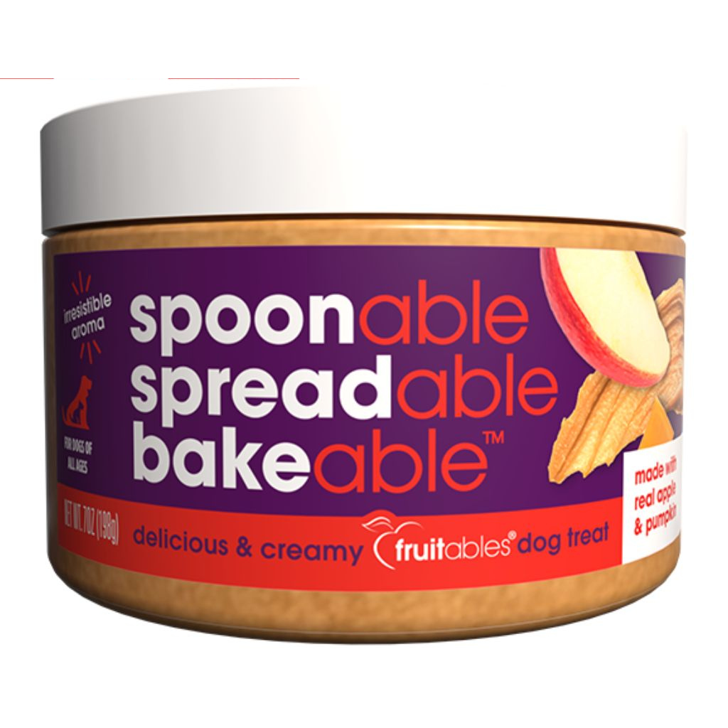 Treat your dog to Fruitables Apple & Pumpkin Spread, a smooth, 100% natural, human-grade delight. Perfect for spreading on treats, feeding by spoon, baking into cookies, or freezing into 'ice cream'—the versatility is endless! Dogs love the amazing flavors. Elevate your dog's snacking experience with this delicious and nutritious spread today!