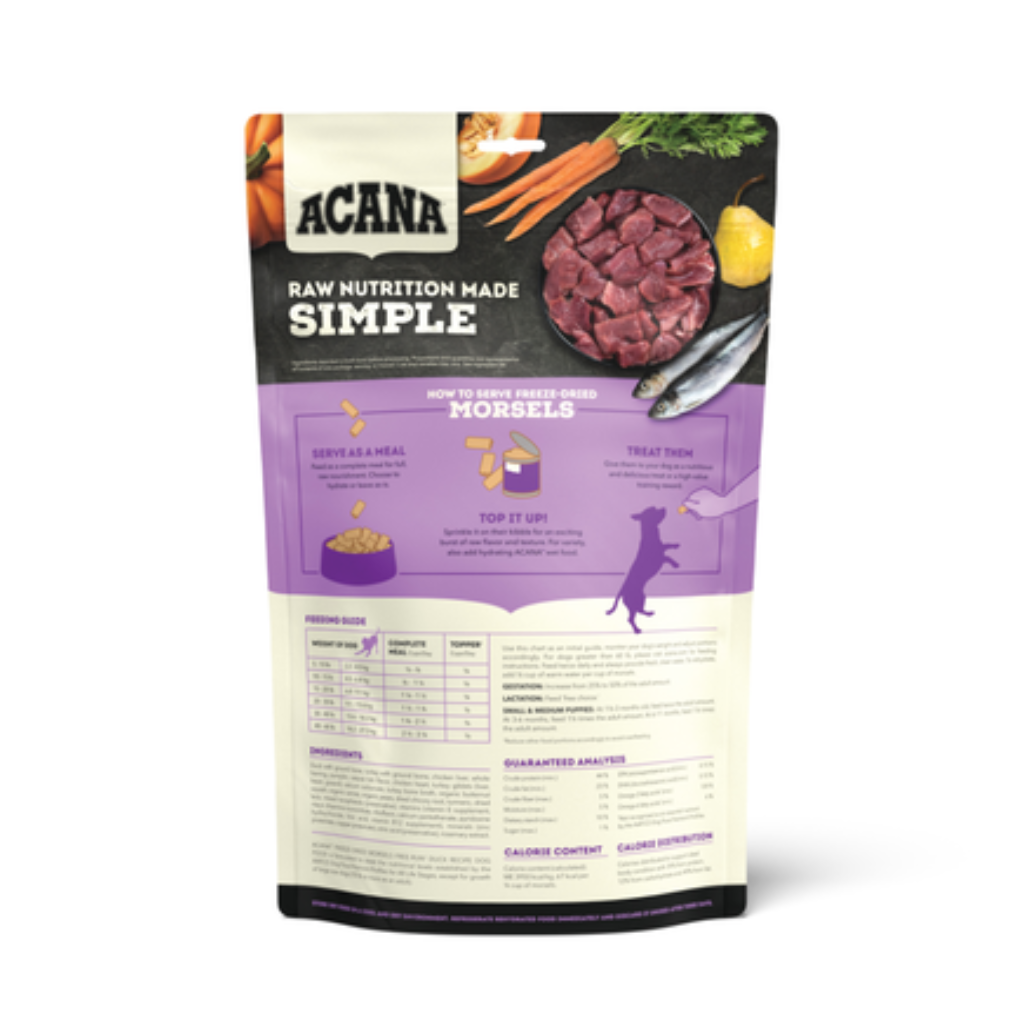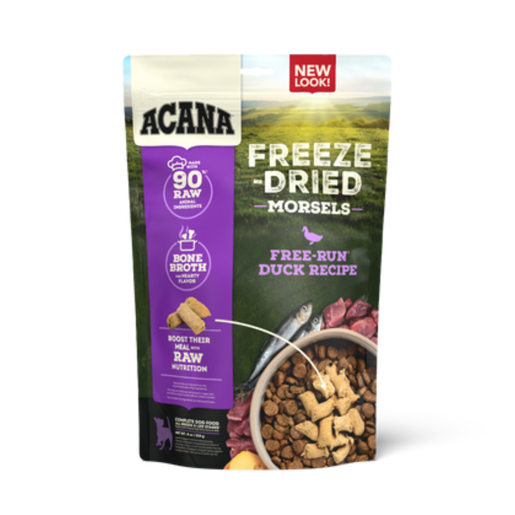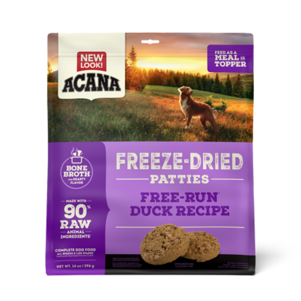 Acana Freeze-Dried Food gives your dog all the benefits of raw nutrition, with none of the mess! Available in bite sized morsels or breakable patties, our high-protein Duck Recipe satisfies your dog’s natural cravings in a convenient, freeze-dried form. It’s made from 90% quality animal ingredients* including duck, chicken and turkey organs and bone, and balanced with wholesome vegetables and fruit. It’s also infused with hearty and delicious bone broth for a taste dogs love. Satisfy your dog’s cravings with the nutritious animal ingredients in Acana Freeze-Dried Food!