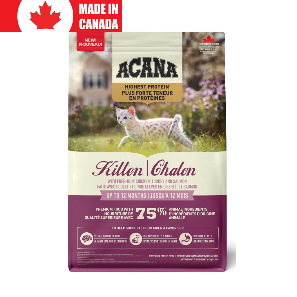 Nurture your growing kitten with more animal protein in ACANA Highest Protein Kitten recipe. Perfect for kittens up to 12 months old, this premium recipe is rich with 75% animal ingredients* including free-run** chicken, turkey, and salmon to satisfy and nourish your young feline. Our nutritious ingredients also help support the healthy development of your kitten, including healthy heart & eyes and digestive health. See your kitten grow up healthy and strong with protein-rich recipe crafted specially for their needs.