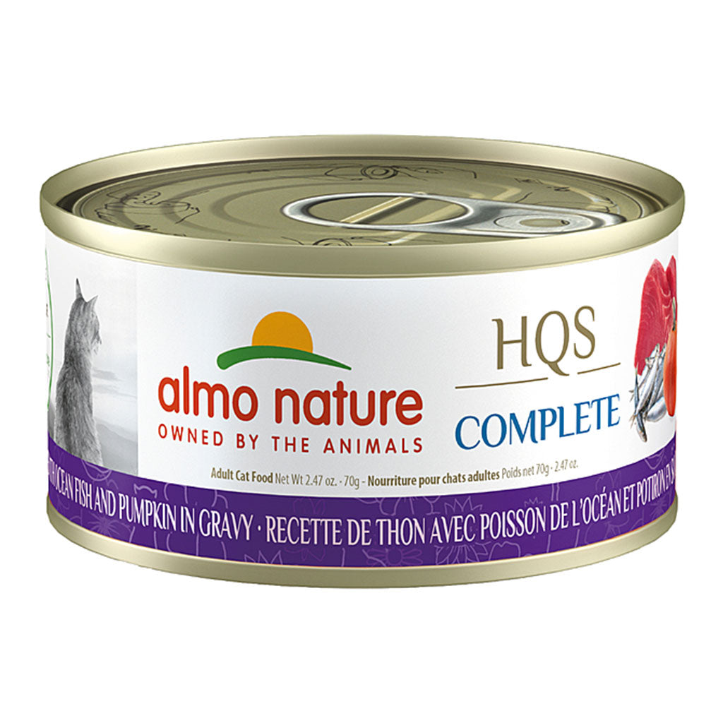 Your kitty will purr with delight when Almo Nature HQS Complete Tuna Recipe w/ Ocean Fish & Pumpkin in Gravy Cat Wet Food is in her dish! This mouthwatering recipe is cooked in an irresistible gravy with all-natural, flaked tuna, ocean fish and pumpkin.