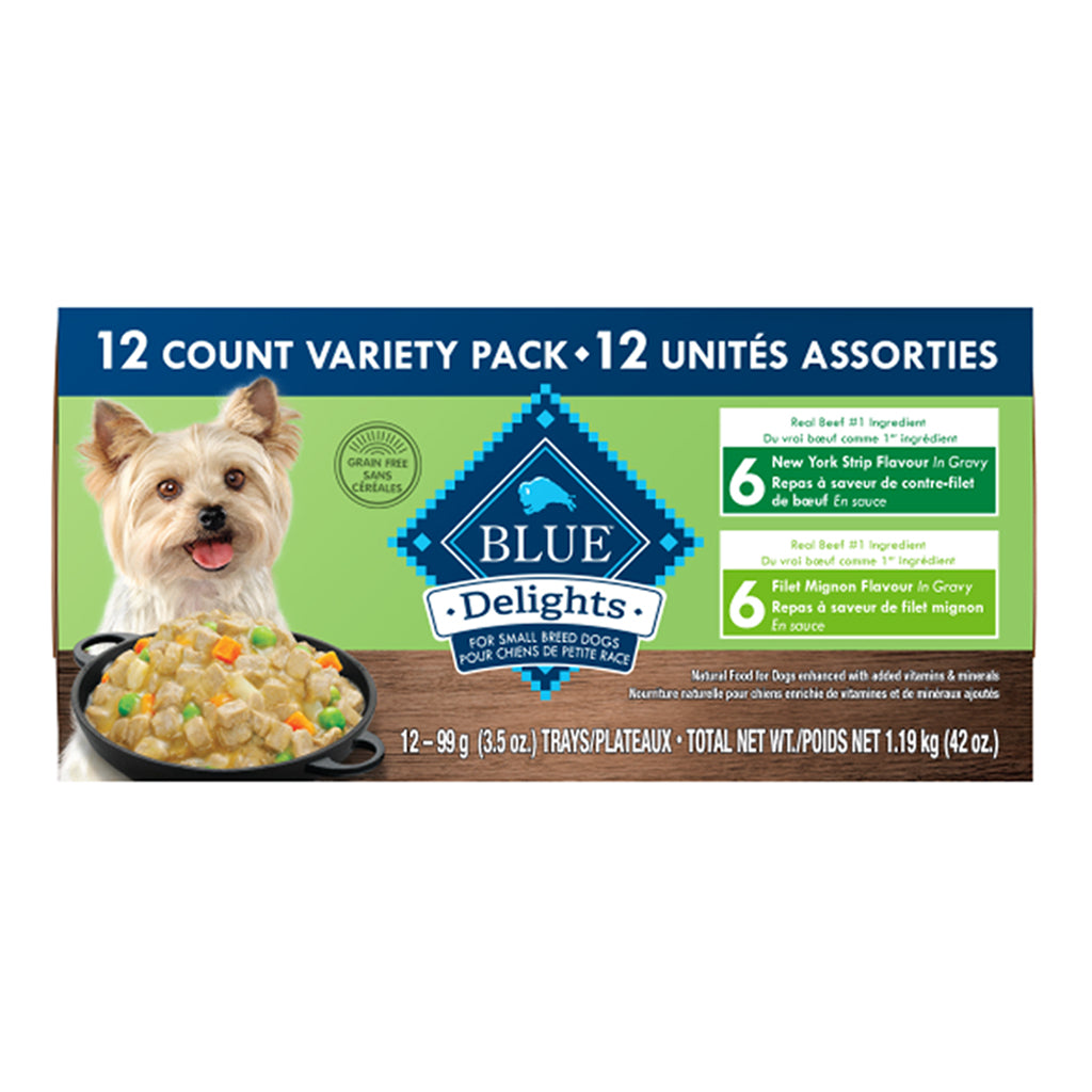 Blue Delights are scrumptious and nutritious single-serving entrées ideal for small dogs with big appetites. Our Filet Mignon recipe features high-quality beef in hearty gravy, plus carrots, potatoes and peas enhanced with vitamins and minerals.