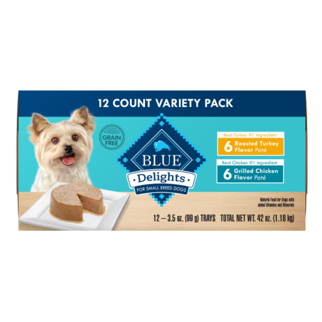 This BLUE Delights Variety Pack contains 6 Roasted Turkey Flavor & 6 Grilled Chicken Flavor. BLUE Delights are scrumptious & nutritious single-serving entrées ideal for small dogs. They're made using the finest natural ingredients enhanced with vitamins & minerals. Roasted Turkey features high-quality turkey in savory juices, plus potatoes, carrots & peas. Grilled Chicken features high-quality chicken in savory juices, plus potatoes, carrots & peas. Both of these natural, gourmet flavors contain no chicken (or poultry) by-product meals, corn, wheat, soy, artificial preservatives or flavors.