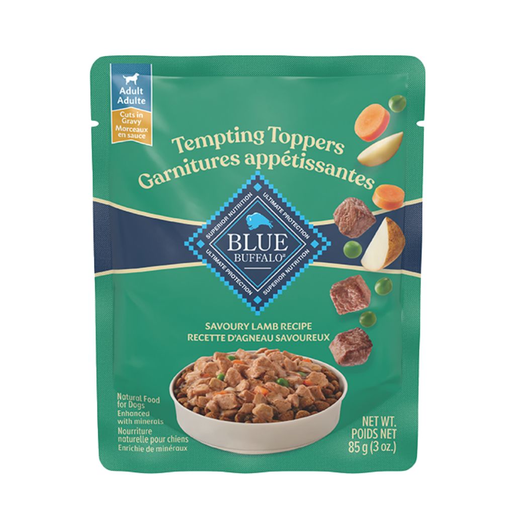 Irresistible BLUE Tempting Toppers Lamb wet dog food starts with high-quality lamb steeped in a savory broth with nutritious veggies. A flavorful addition to your dog's Blue Buffalo dry food, Tempting Toppers can be served as a tasty meal topper, mix-in or healthy snack on its own. Available in handy, single-serve pouches that are easy to open and store, Tempting Toppers make mealtime quick and convenient for you and delicious for your dog.