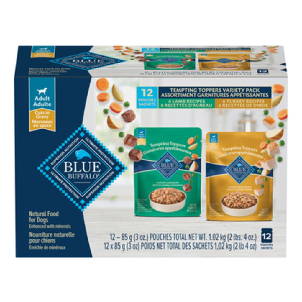 Irresistible BLUE Tempting Toppers wet dog food starts with high-quality lamb or turkey steeped in a savory broth with nutritious veggies. A flavorful addition to your dog's Blue Buffalo dry food, Tempting Toppers can be served as a tasty meal topper, mix-in or healthy snack on its own. Available in handy, single-serve pouches that are easy to open and store, Tempting Toppers make mealtime quick and convenient for you and delicious for your dog.