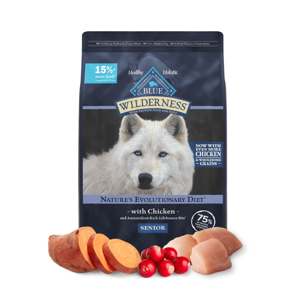 Satisfy the spirit of the wolf with meat-rich BLUE Wilderness. This high-protein recipe contains more of the delicious deboned chicken your senior dog loves, with wholesome grains like oats, barley, and brown rice, plus glucosamine and chondroitin to support joint health and mobility.