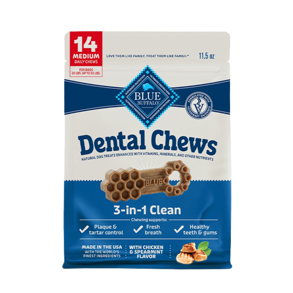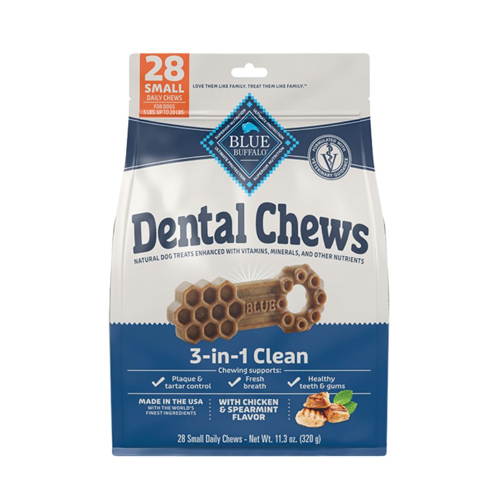 BLUE Dental Chews feature a unique shape and texture to help promote healthy teeth and gums while managing plaque and tartar buildup, too. Made with real chicken - and free of wheat - these naturally tasty treats contain essential vitamins, minerals, and nutrients to take oral health to the next level. Ingredients Parsley & Spearmint will help with fresh breath.