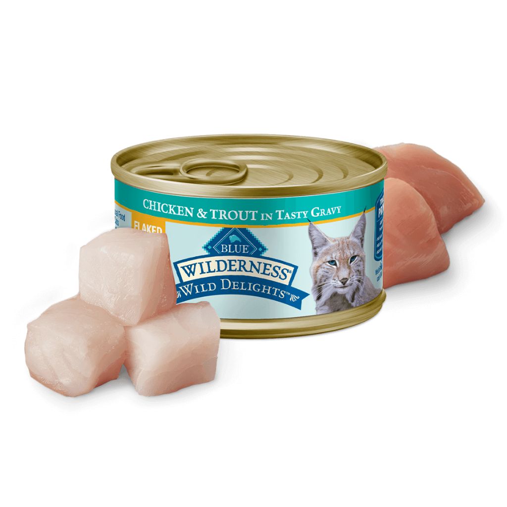 BLUE Wilderness Wild Delights features two delicious protein sources. Tender, flaky chicken and succulent trout are accompanied by a rich gravy, making this a true feline favorite
