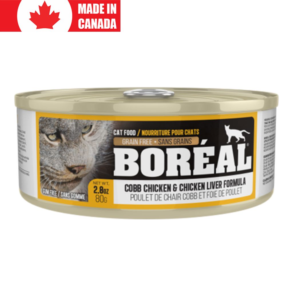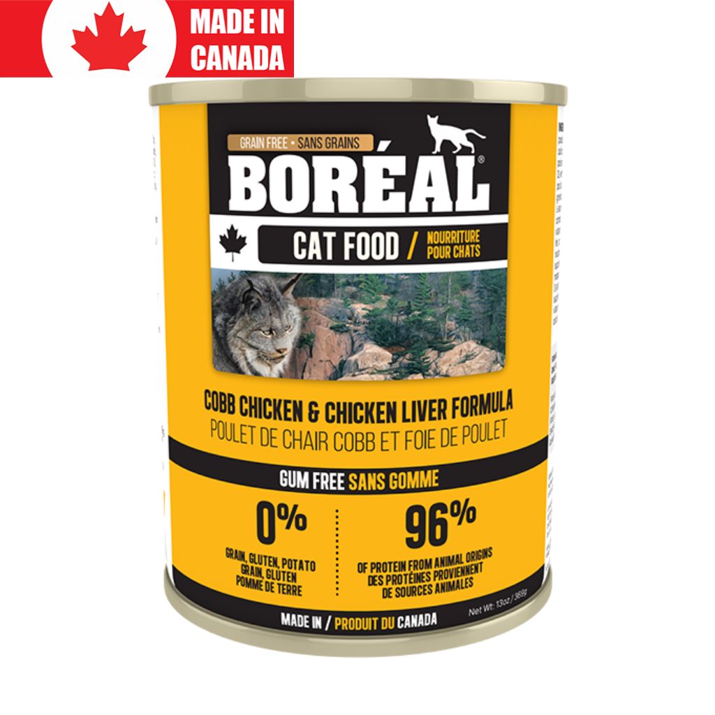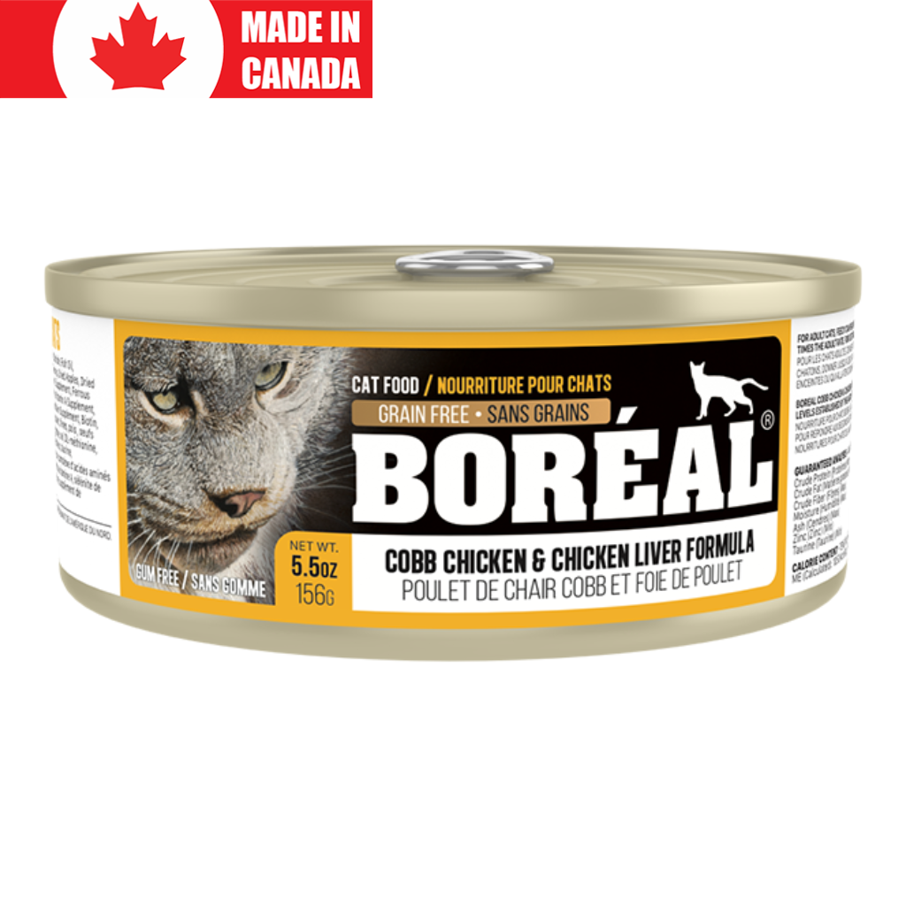 Boreal canned cat foods have 95% of the protein from Meat/Fish and are designed to have almost no carbohydrates or starches. This Canadian-made line is gum free and gluten free. The Cobb Chicken and Chicken Liver cat food is made from Canadian chicken. It is made with no cereals, grains, artificial colour, gums or thickeners added. Zinc and manganese are added as they are important for skin health and coat quality. This includes better hair coat length and shine, and enhanced skin integrity and wound healing.