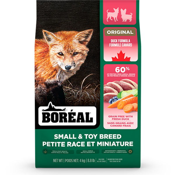 Our grain-free diet is designed for small breeds, with specifically shaped small kibbles to help remove dental plaque and tarter on small breed dogs. By using highly digestible duck and dried whole eggs this is an ideal diet for small breed dogs with sensitive stomachs. This is an everyday diet that can be used to help keep weight off your dog as well as can be used as a hypoallergenic formula. Using a core of beans and peas to replace the grains found in many dog foods, Boreal is a low carbohydrate, low glycemic index diet that will help keep the dog feeling full longer and reduce spikes in blood sugar. 40% of the protein is from vegetables and fruits and 60% of the protein is from duck, eggs, and fish.