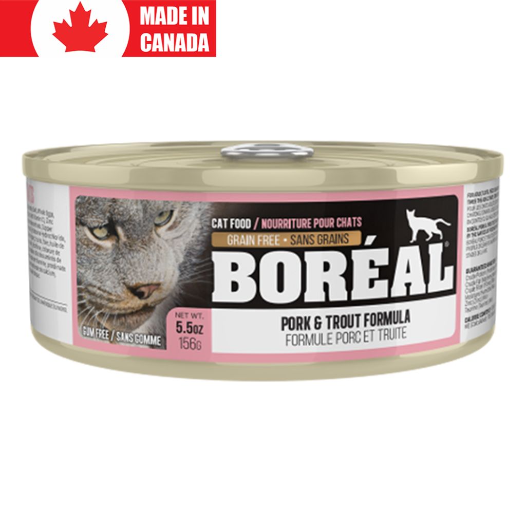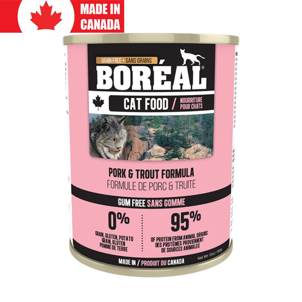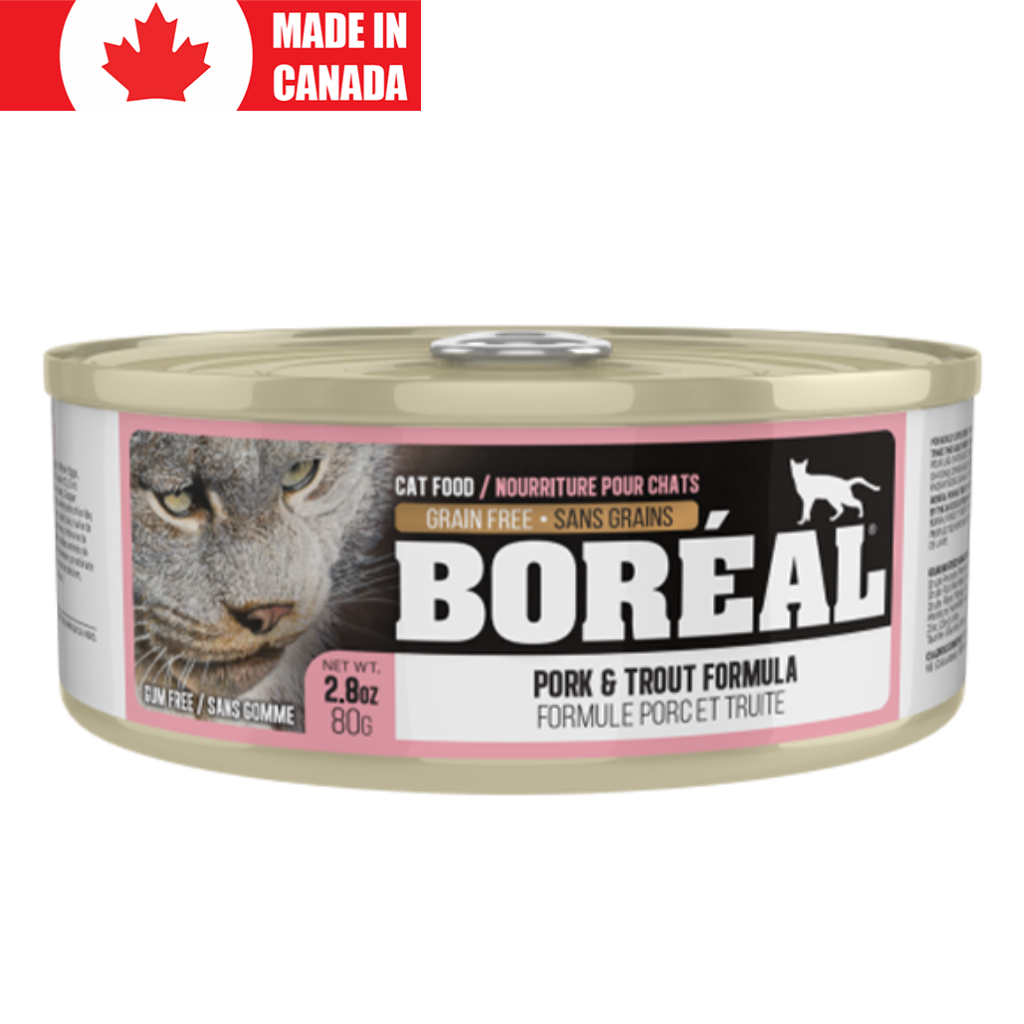 Boreal canned cat foods have 95% of the protein from Meat/Fish and are designed to have almost no carbohydrates or starches. This Canadian-made line is gum free and gluten free. The Pork and Trout cat food is made from Canadian pork and trout. It is made with no cereals, grains, artificial colour, gums or thickeners added. Zinc and manganese are added as they are important for skin health and coat quality. This includes better hair coat length and shine, and enhanced skin integrity and wound healing.