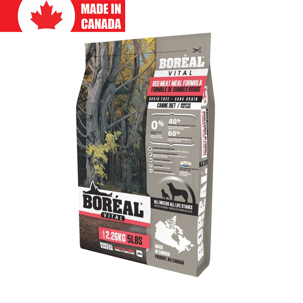 Boréal Vital All Breed Red Meat Meal is a grain free diet with a limited ingredient list. This is an everyday diet which can be used to help keep weight off your dog as well can be used as a hypoallergenic formula. Using a core of beans and peas to replace the grains found in many dog foods, this low glycemic index ingredients will help keep a dog feeling full longer after they eat. Canadian pork is sourced whenever available along with Australian lamb. Prebiotics are added to aid in digestion, taurine for a healthy heart, and unique organic minerals for deeper coat color & improved mobility.