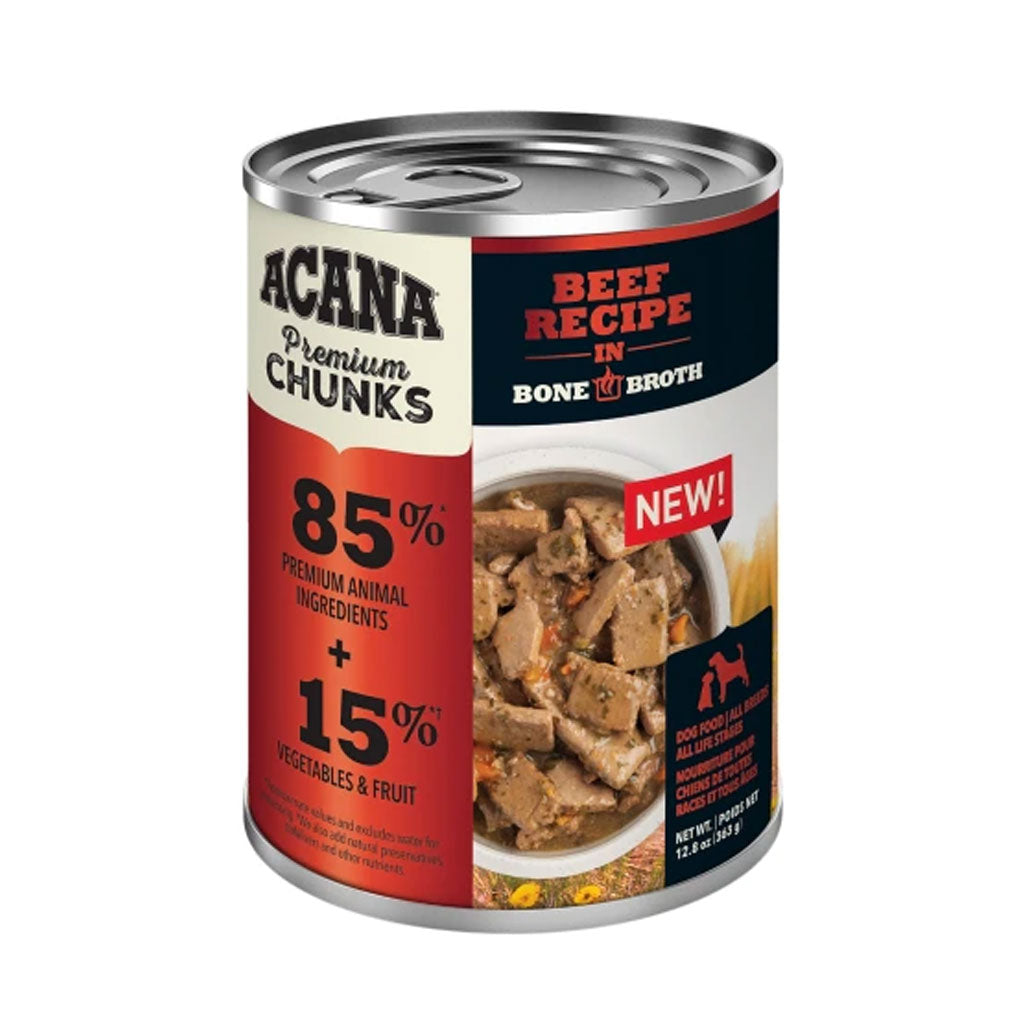 Every can of Acana Premium Chunks is crafted thoughtfully from start to finish. Our Beef Recipe in Bone Broth is crafted with 85% animal ingredients in the form of premium chunks of beef and lamb. It’s also balanced with 15% visible fruit and vegetables in a savory bone broth base your dog will love. Add it as a topper on your dog’s favorite ACANA kibble to provide them with more hydration and crave-worthy flavor, or feed alone for an indulgent treat at mealtime