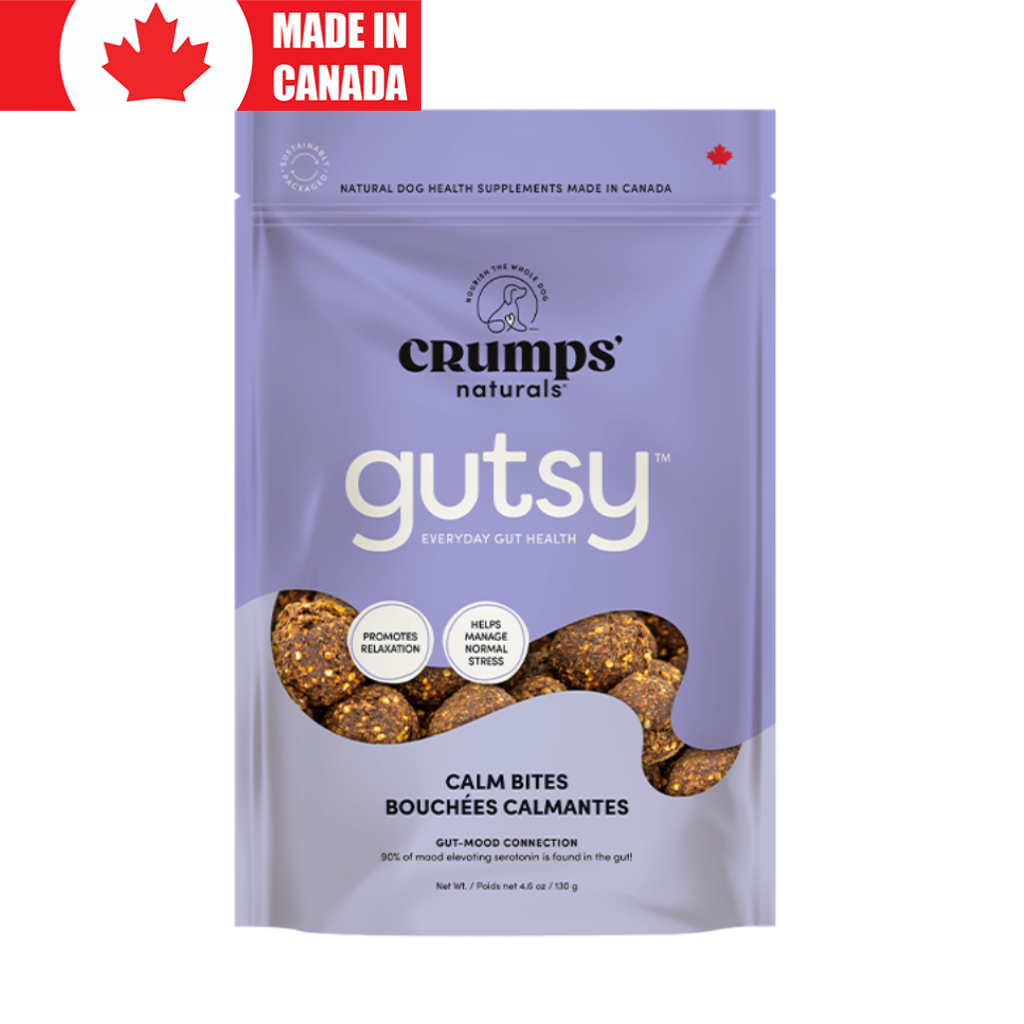 Did you know that 90% of mood elevating serotonin is found in the gut? Gutsy Calm Bites have powerful prebiotics and scientifically pet-proven calming ingredients in every bite. Crafted with holistic calming ingredients like Ashwagandha (a natural adaptogen) and Reishi mushrooms, these bites are specially designed to promote relaxation, soothe your pet, and help them manage everyday stress. Made lovingly in Canada in small batches, Gutsy offers a deliciously simple proactive solution to whole dog health.