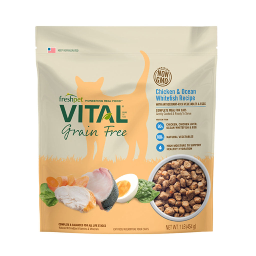A high protein, a grain-free complete meal made of 100% natural fresh chicken and eggs with antioxidant-rich spinach and carrots. Verified Non-GMO.