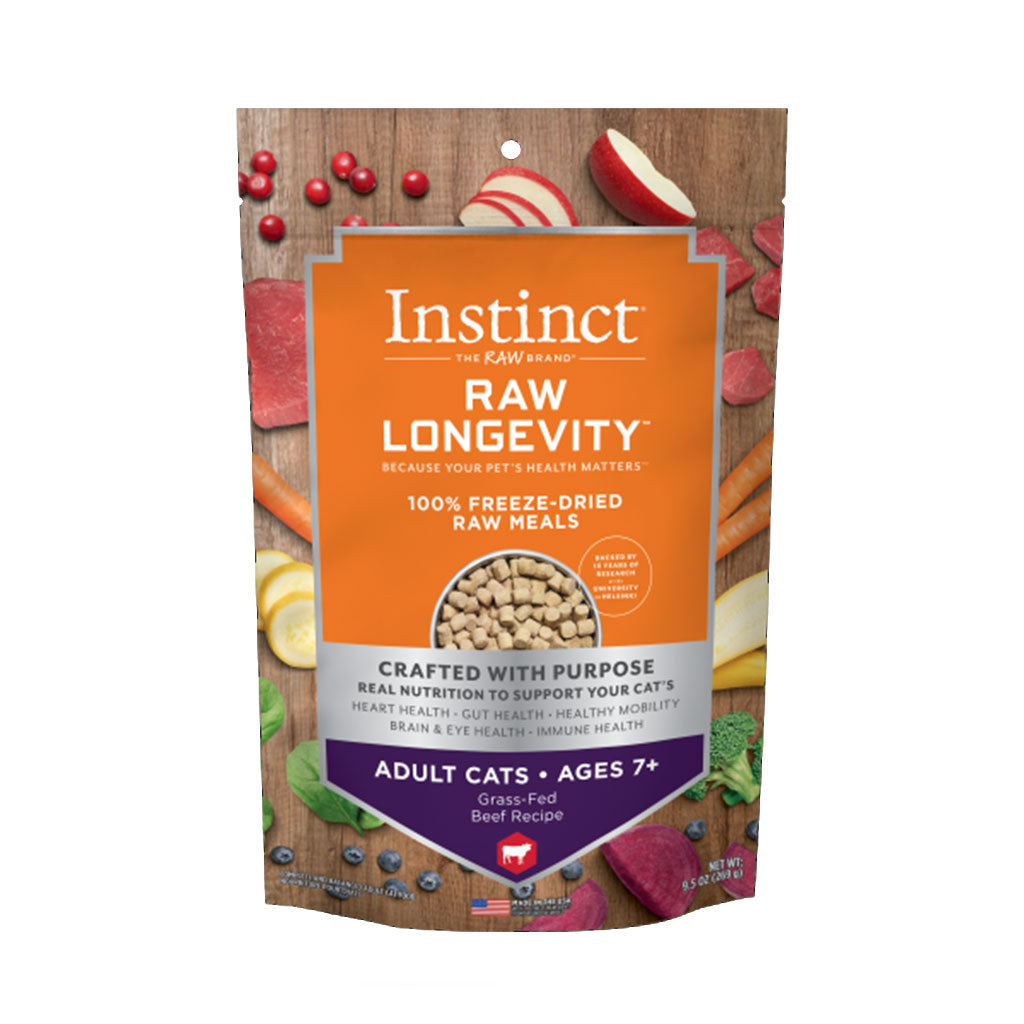 Instinct® Raw Longevity™ 100% Freeze-Dried Raw Meals Grass-Fed Beef Recipe for Adult Cats Ages 7+ is formulated to meet the nutritional levels established by the AAFCO Cat Food Nutrient Profiles for maintenance.