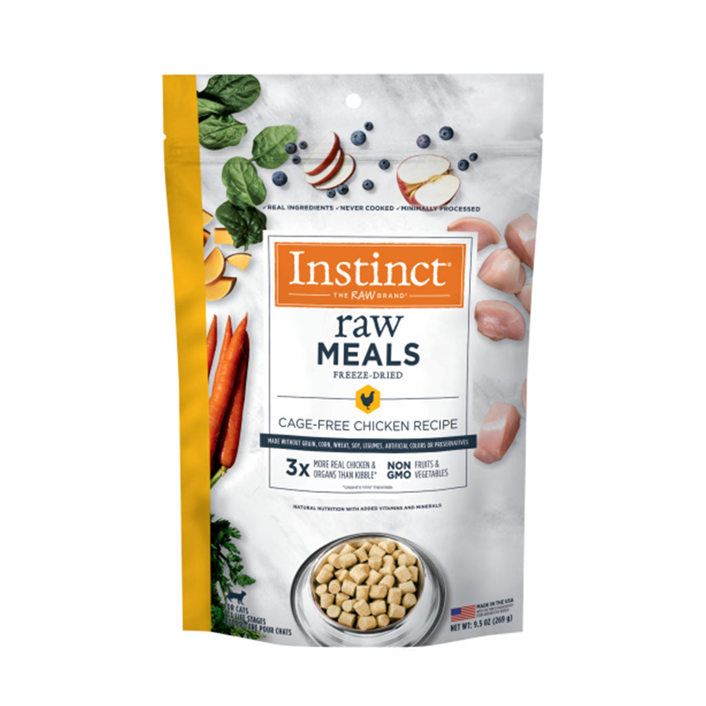 Upgrade your cat's bowl from kibble to freeze-dried raw. Each Instinct Raw Freeze-Dried Meals recipe is protein-packed with 85% meat & organs and 15% non-GMO fruits, vegetables; vitamins & minerals. Made without grain, corn, wheat, soy, legumes, artificial colors, or preservatives.