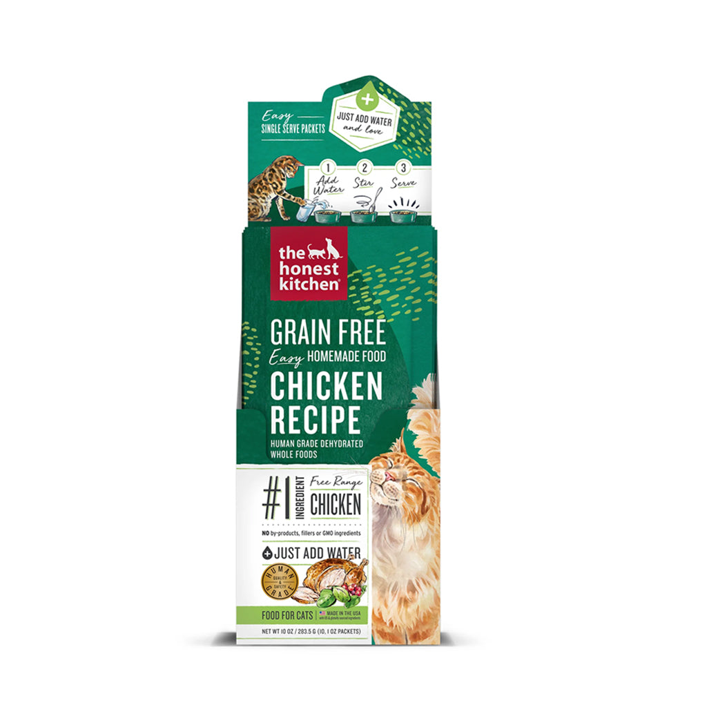 Crafted with a vet nutritionist, this 100% human grade grain free dehydrated cat food recipe is packed with tasty free range chicken, boosted with probiotics to support digestion, and finished with a splash of nutritious bone broth to add extra flavor and boost protein. To meet our human grade standard, we use the same whole foods you’d recognize in your own kitchen, and make this recipe in a human food facility. Simply add water to this healthy-yet-tasty recipe for a protein-packed, moisture-rich meal your cat will love.