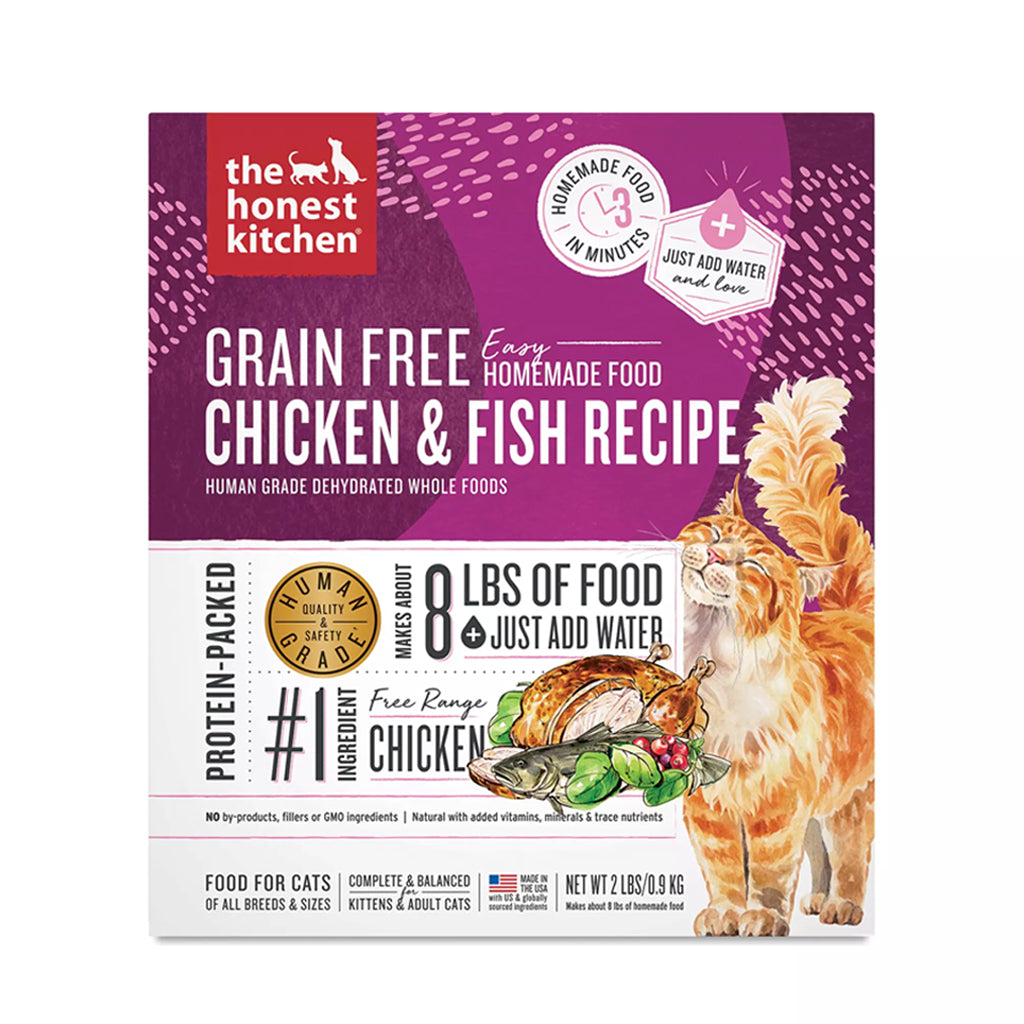 Crafted with a vet nutritionist, this 100% human grade grain free dehydrated cat food recipe is packed with a delicious pairing of free range chicken and wild caught fish, boosted with probiotics to support digestion, and finished with a splash of nutritious bone broth to add extra flavor and boost protein. To meet our human grade standard, we use the same whole foods you’d recognize in your own kitchen, and make this recipe in a human food facility. Simply add water to this healthy-yet-tasty recipe for a protein-packed, moisture-rich meal your cat will love.