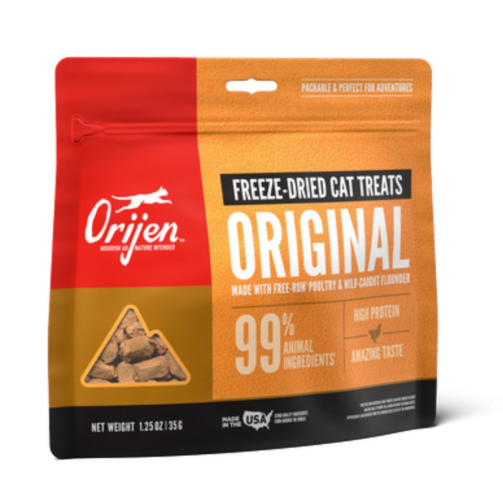 Treat your cat to nutritious and delicious Orijen® Freeze-Dried Treats. Packed with animal protein, our Original Recipe is made with 99% animal ingredients1 including nourishing free-run2 poultry and wild-caught flounder. Freeze-dried to lock in their rich nutrients and taste, they’re packable and perfect for adventures. At just one calorie each, Orijen Freeze-Dried Treats are loaded with protein and amazing flavor.