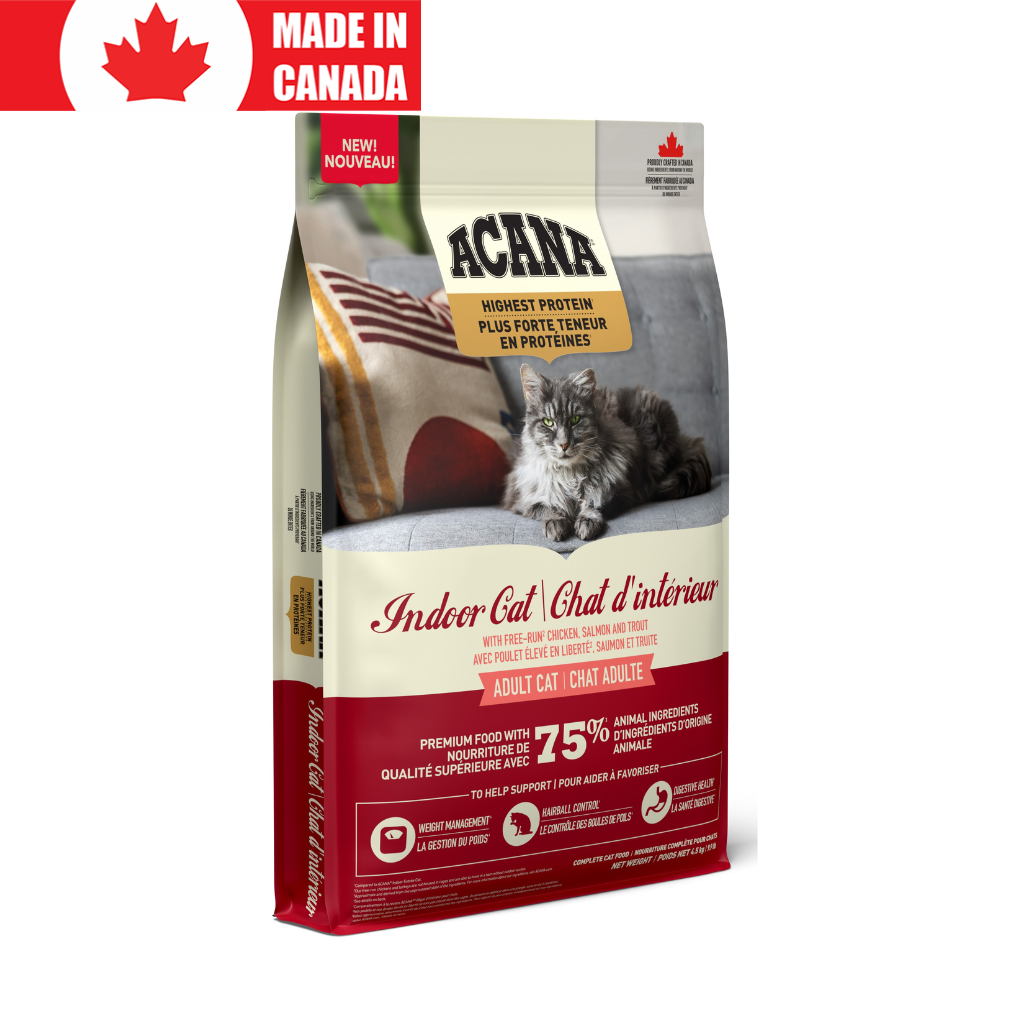 ACANA Highest Protein Indoor Cat recipe is our first no-added grains recipe for indoor cats! Rich with free-run chicken, trout and salmon, this premium recipe is crafted with 75% animal ingredients to satisfy your indoor feline’s craving for more protein. To help meet the unique needs of your indoor cat, it helps support 3 unique health benefits, including weight maintenance to help them maintain a healthy weight. A blend of probiotics and fiber help support digestive health and Omega-3 and Omega-6 fatty acids help support a healthy skin and a shiny coat. Nourish your indoor cat’s cravings for more animal protein while supporting their unique needs with ACANA Highest Protein Indoor Cat recipe!