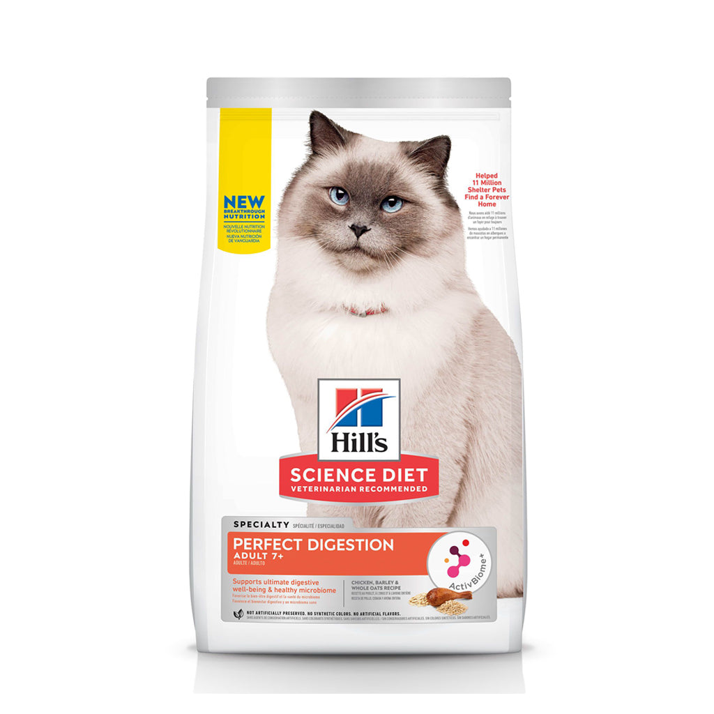 Every cat has an entire ecosystem living within them - the gut microbiome, full of billions of desirable & undesirable bacteria unique to your pet. The right nutrients help balance their microbiome. You can actually affect not only their digestive health, but their overall well-being during their golden years. That's why we developed Science Diet Perfect Digestion dry cat food with our ActivBiome+ Technology ingredient blend of prebiotics. It's breakthrough nutrition supports each cat's unique gut microbiome for healthy digestion and balanced nutrition to help your cat age 7+ feel their best.