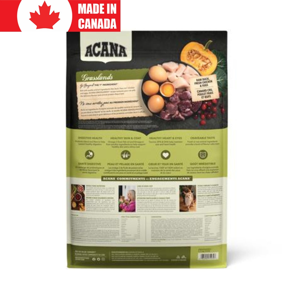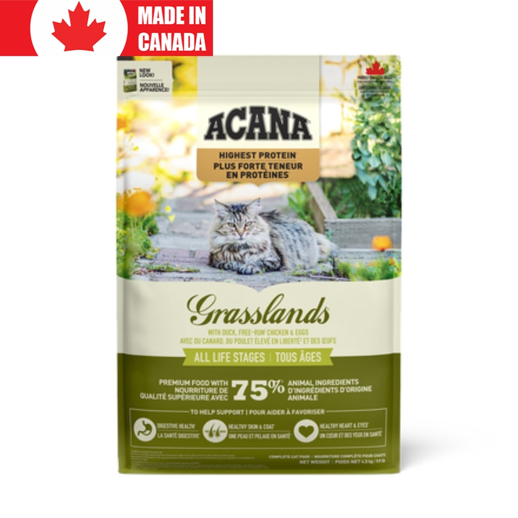 Rich with the highest level of animal protein, our Acana Highest Protein Grasslands Recipe will satisfy your cat completely with its rich duck and poultry ingredients and flavour. Crafted with 75% animal ingredients including duck, free-run chicken and turkey, and eggs , this recipe provides your cat with a variety of nourishing animal protein. This nutrient-dense recipe also helps support key health benefits including your cat’s digestive health, healthy skin & coat, and healthy heart & eyes. Nurture your feline com