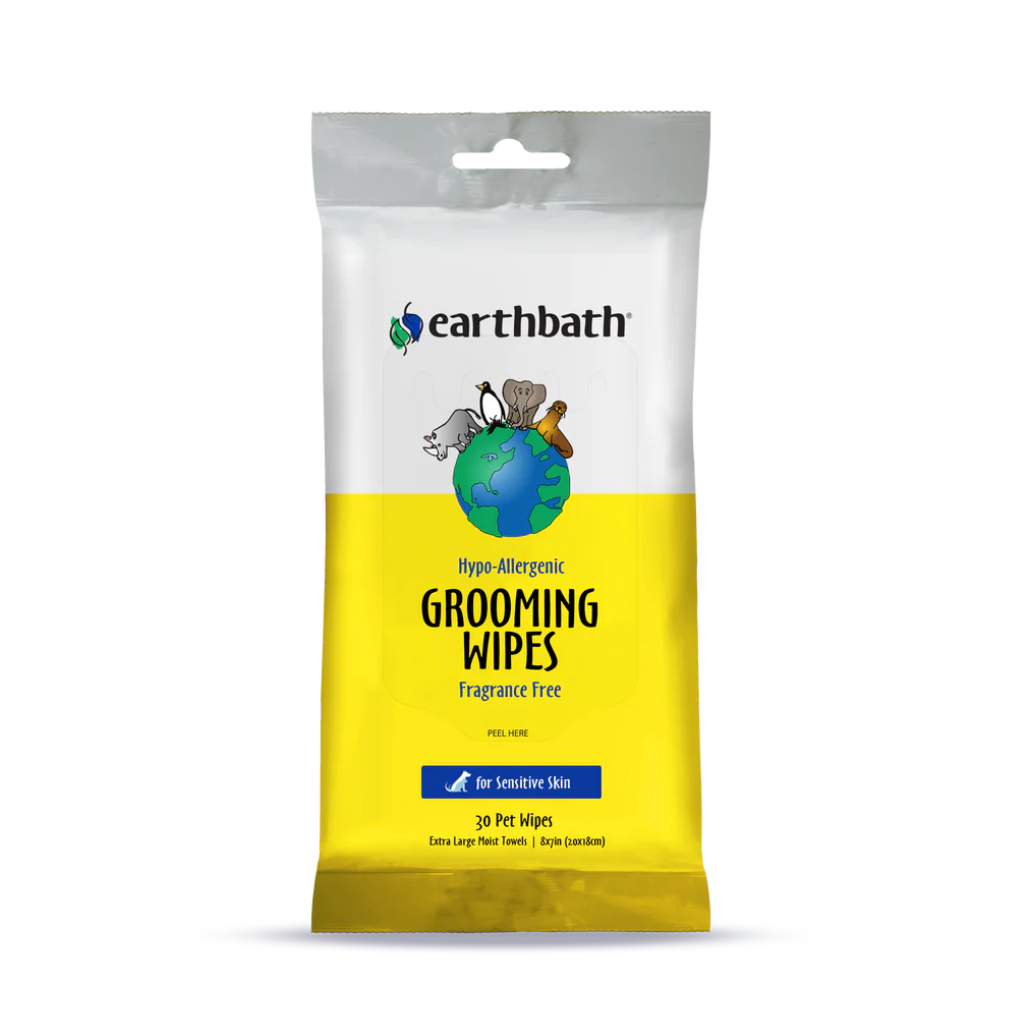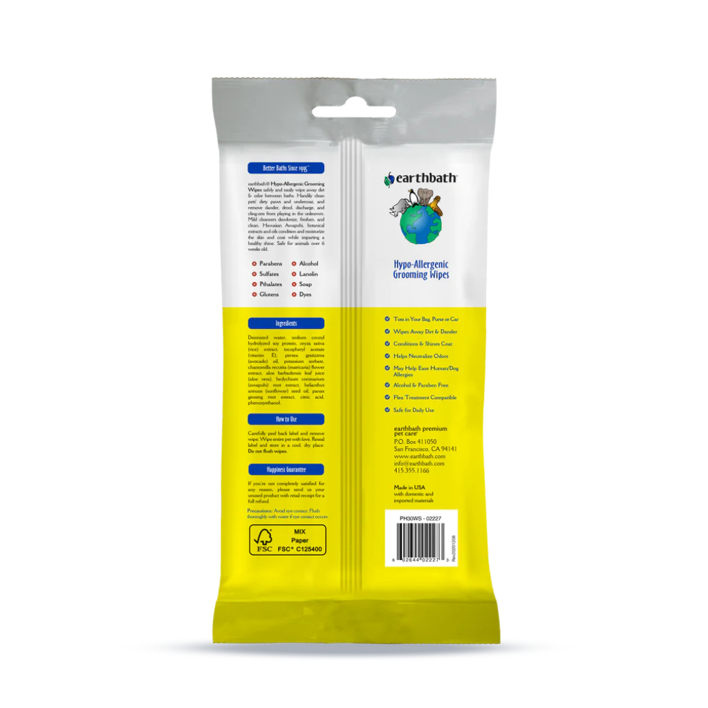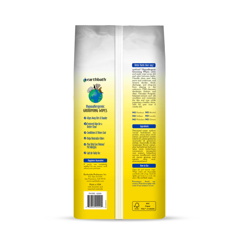 Earthbath® Hypoallergenic Grooming Wipes clean dirt, odor, and dander with ease. These plant-based wipes refresh paws and undercoat while removing drool and cling-ons. Infused with Hawaiian Awapuhi and botanical extracts to condition and moisturize, they leave pets' coats shiny and fresh. Safe for daily use on pets over 6 weeks old.