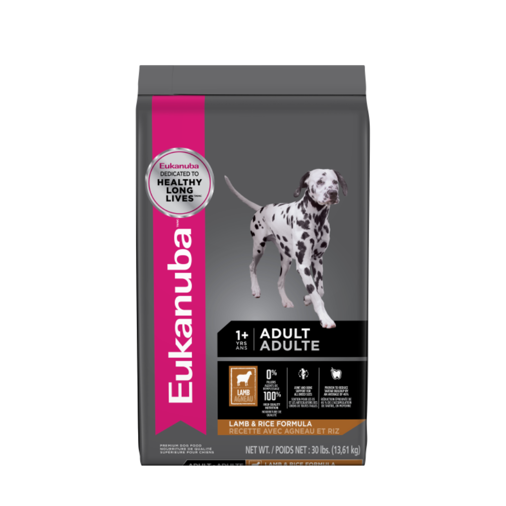 Eukanuba Adult Lamb & Rice provides high-quality nutrition in this complete and balanced food for adult dogs. It helps support joints and bones while Omega-3 & -6 fatty acids aid in healthy skin and a radiant coat. Eukanuba's 3D DentaDefense is proven to reduce tartar buildup.