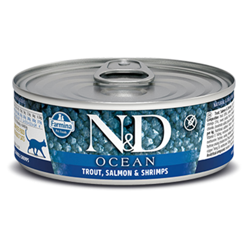 N&D Ocean Cat Trout, Salmon & Shrimp Recipe is formulated to meet the nutritional levels established by the AAFCO Cat Food Nutrient Profiles for maintenance. 100% Satisfaction Guaranteed.