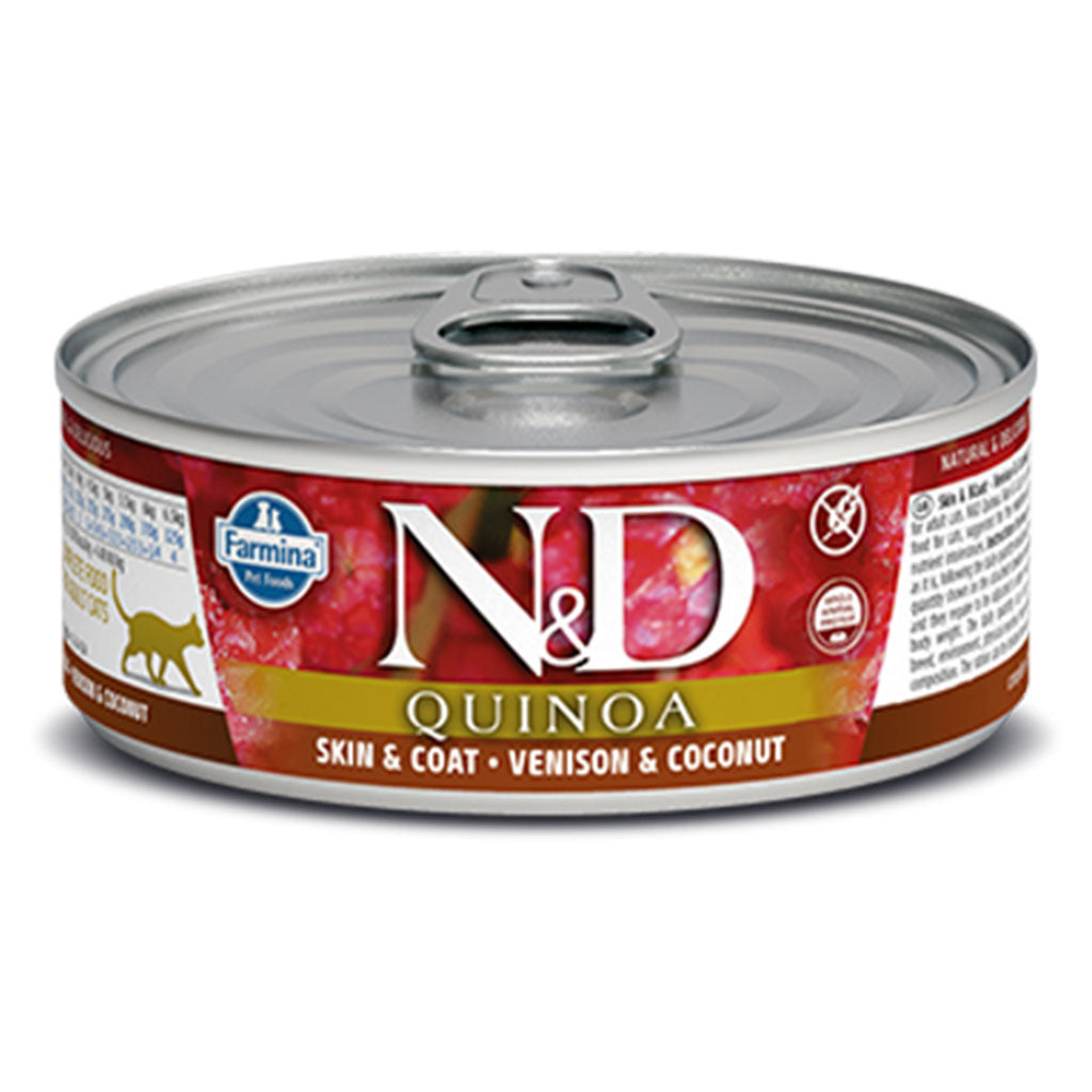 N&D Quinoa Cat Skin & Coat Venison & Coconut Recipe is formulated to meet the nutritional levels established by the AAFCO Cat Food Nutrient Profiles for maintenance. 100% Satisfaction Guaranteed.