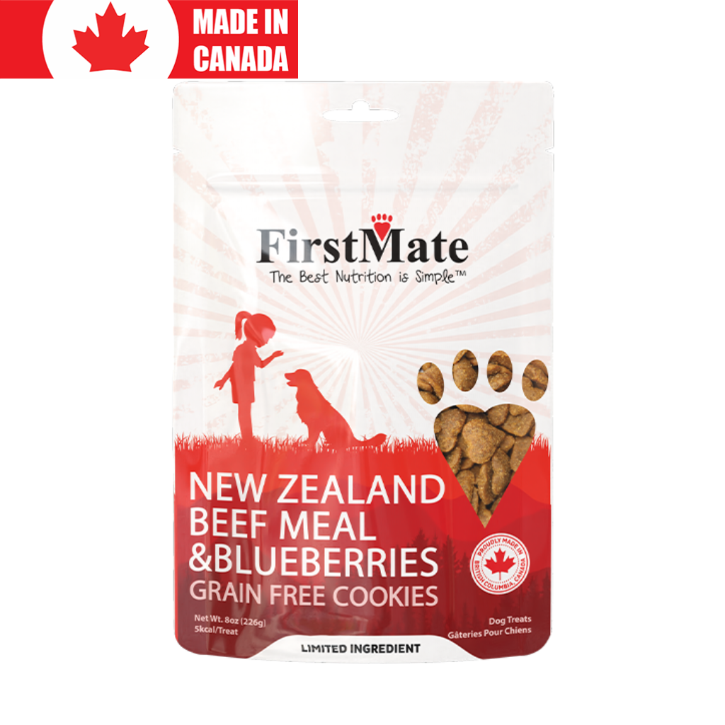 FirstMate’s Limited Ingredient Chicken & Blueberries Treats are designed to be a meat-based alternative to a typical biscuit. We proudly use cage-free, humanely raised Chicken as our primary protein source. This grain, glycerine, gluten, and pea-free formula is ideal for everyday use as a treat or training aid for your dog.