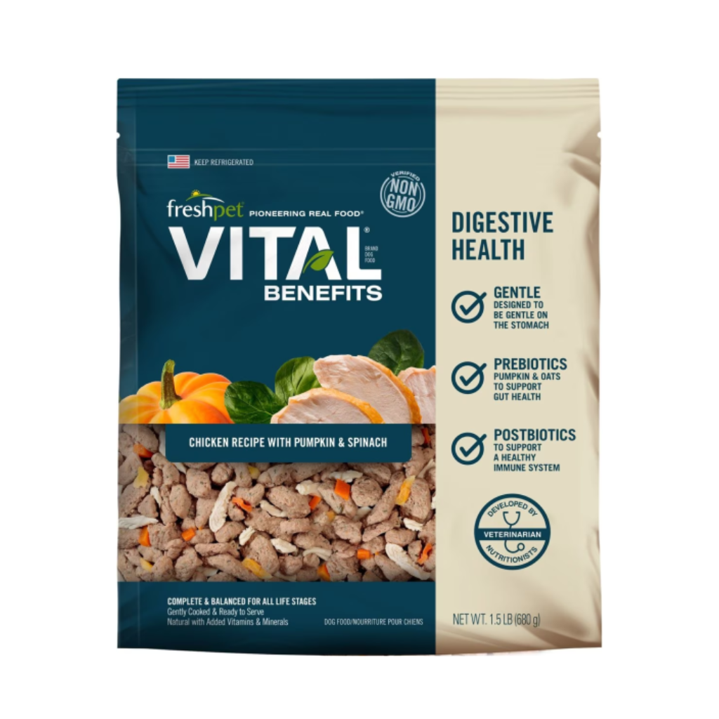 Vital Benefits Digestive Health Chicken with Pumpkin & Spinach recipe is packed with pre- and pro-biotics to help your dog's digestion. It's made of fresh chicken, steam cooked to lock in key nutrients and remain highly digestible. Oat fiber and pumpkin contain prebiotics that help stimulate the growth of healthy bacteria in the gut. A precise blend of postbiotics promotes a healthy gut microbiome to support the immune system. Complete & balanced for all life stages, it's non-GMO verified and has no nitrates.