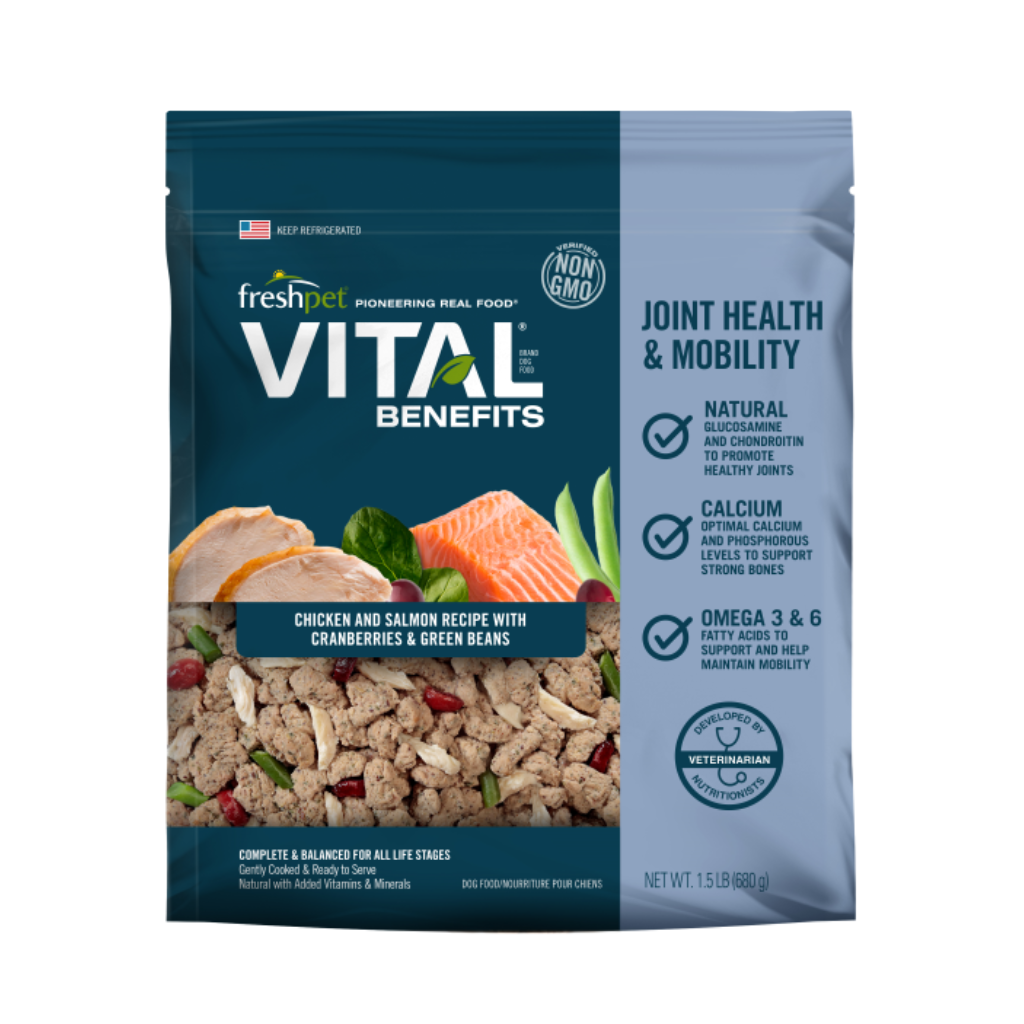 Vital Benefits Joint Health & Mobility Chicken and Salmon Recipe supports your dog's joints with fresh chicken, a natural source of glucosamine and chondroitin. Omega 3 & 6 fatty acids promote mobility, while cranberries and green beans add nutritional balance. Non-GMO and nitrate-free, it's complete for all life stages!