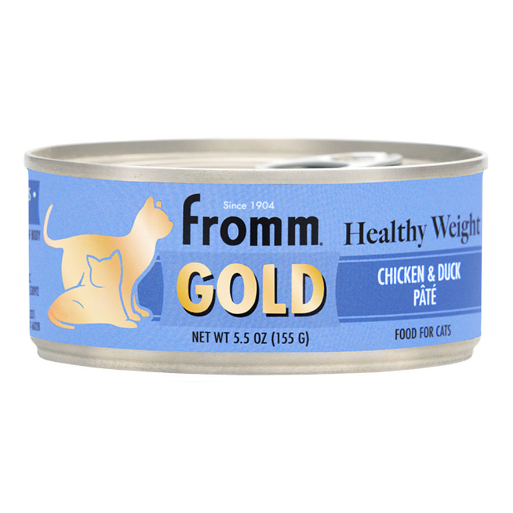 Fromm Gold Healthy Weight Chicken & Duck Pate Cat food cans are specially formulated to control calorie intake and provide your less active adult cat with complete and balanced nutrition, while helping to achieve and maintain an ideal body weight with high-quality proteins and wholesome ingredients. This recipe features high quality chicken, healthy skin with a shiny coat, and increased moisture to help your pet with hydration.