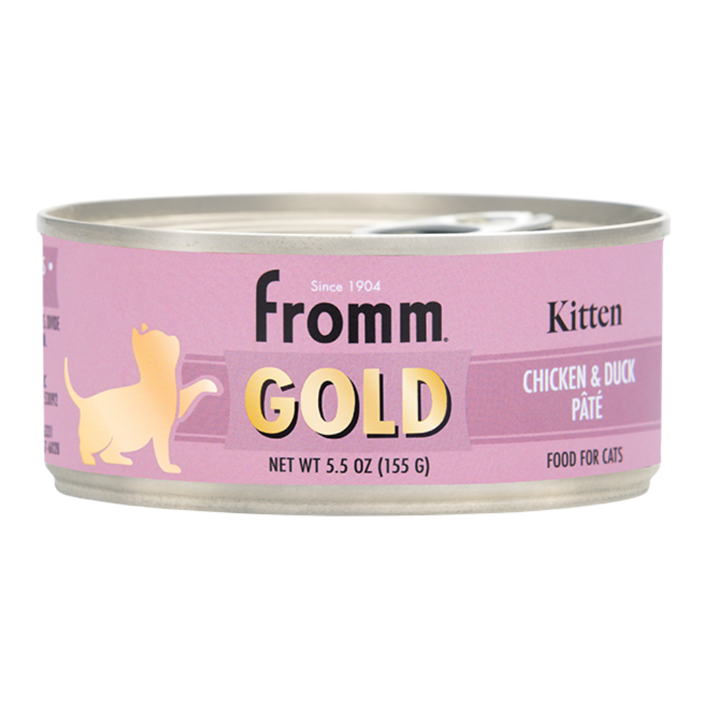 Fromm Gold Kitten Chicken & Duck Pate Cat food cans are formulated to provide your kitten, gestating cat, or lactating cat with complete and balanced nutrition with high-quality proteins and wholesome ingredients. Enhanced with omega-rich ingredients to support brain development, healthy skin, and shiny coat. This recipe features high quality chicken, healthy skin, shiny coat as well as increased moisture to help your pet with hydration.