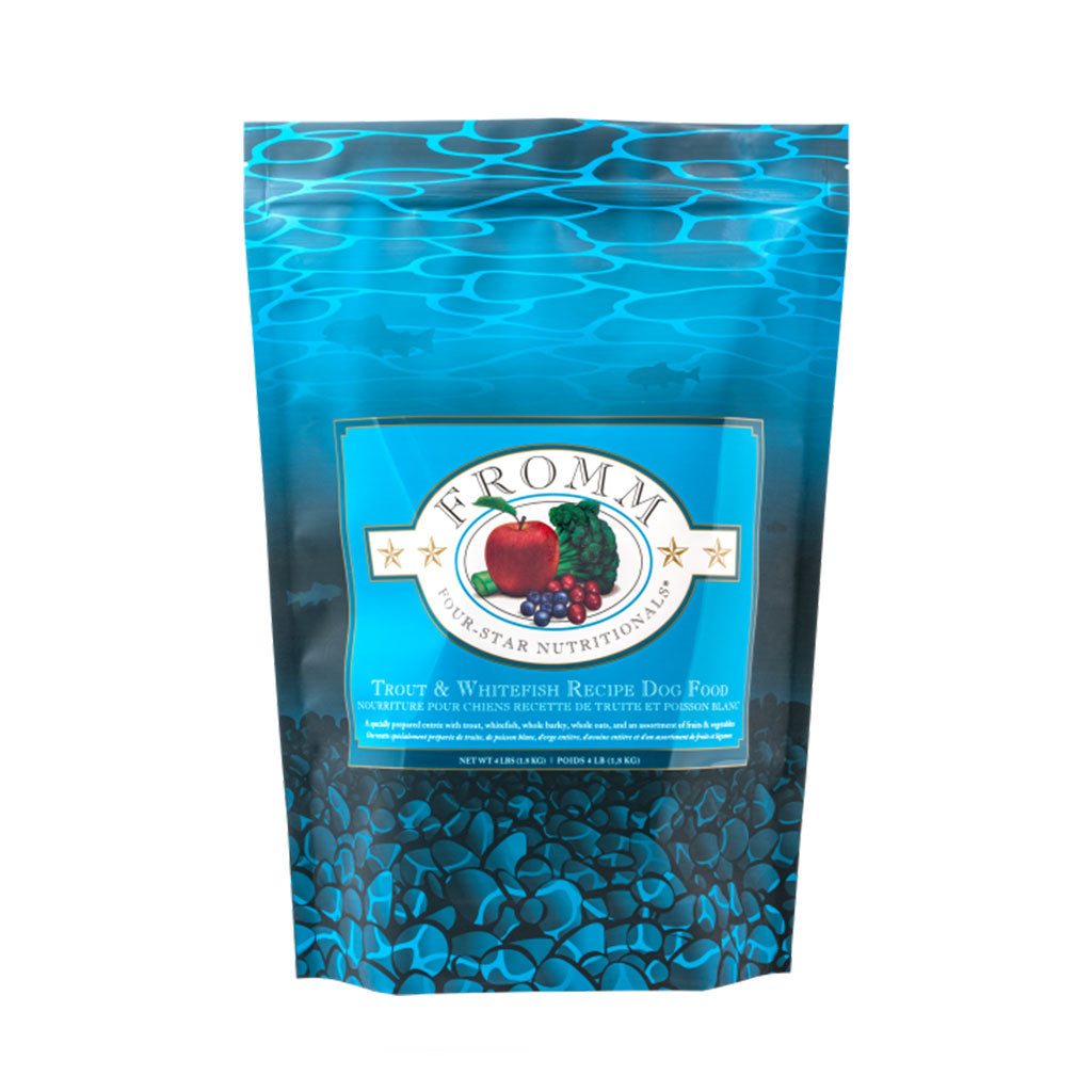 A specially prepared entrée with trout, whitefish, whole barley, whole oats, and an assortment of fruits & vegetables