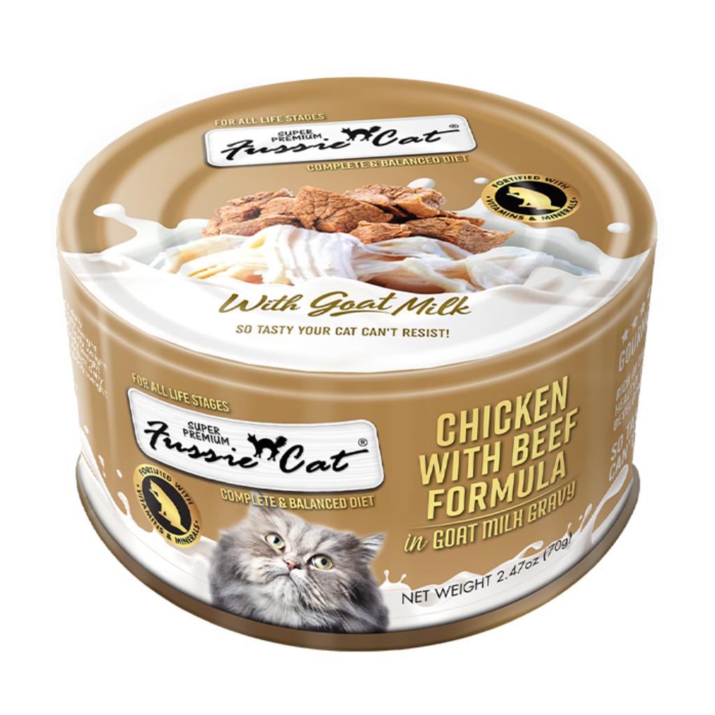 Delight your cat with Fussie Cat’s Chicken With Beef in Goat Milk Gravy. This high-protein, grain-free recipe combines tender chicken and beef, enriched with DHA for brain and vision health. Perfect for cats at any stage of life, it offers a delicious and nutritious meal that promotes overall well-being.
