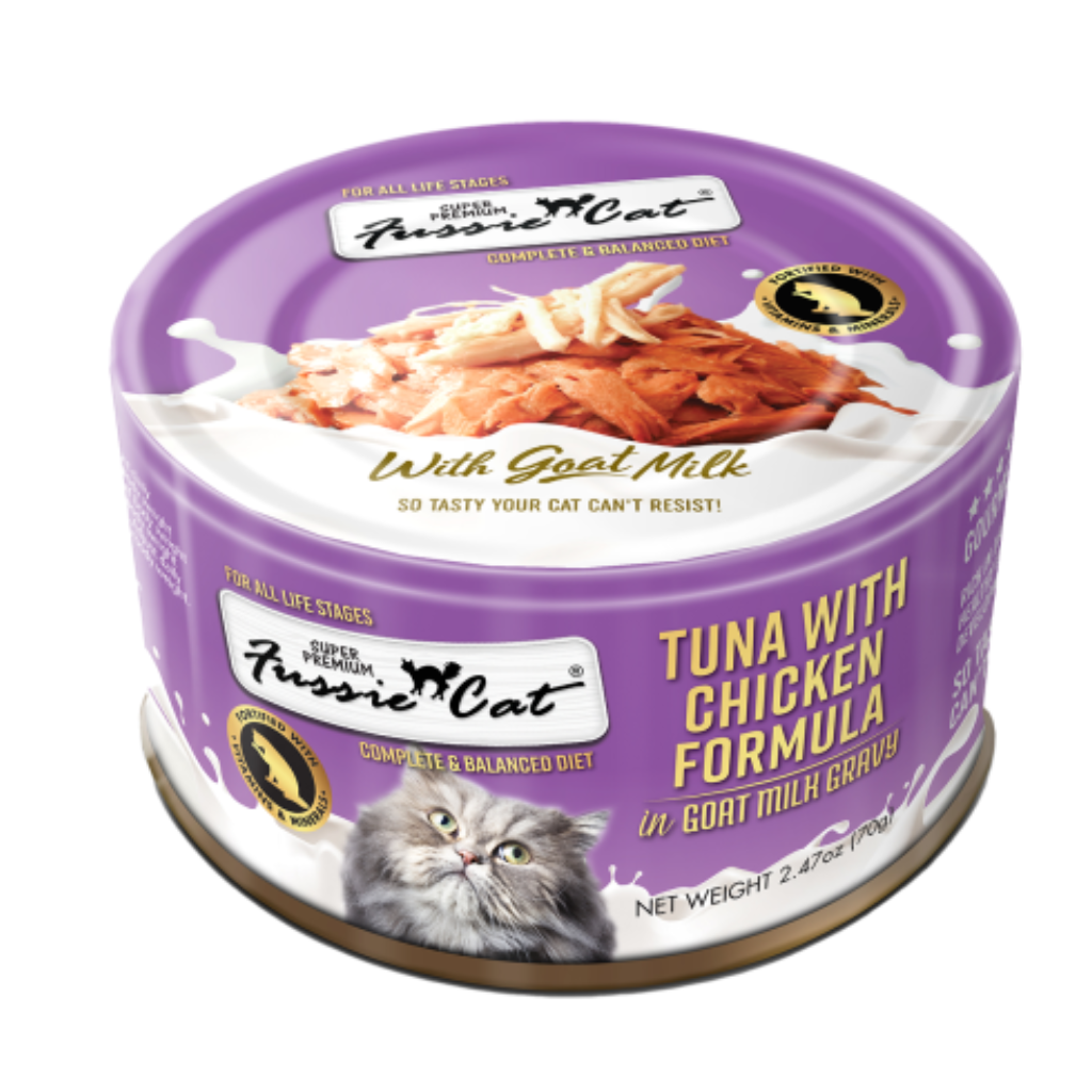 Introducing Fussie Cat Tuna with Chicken in Goat Milk Gravy! This new line of gourmet cat food features delicate, tender bites of tuna with a creamy goat milk gravy to make up a complete and balanced diet for your carnivore's connoisseur! Fussie Cat with Goat Milk is rich in DHA to help support healthy vision and brain development and is fortified with vitamins and minerals.