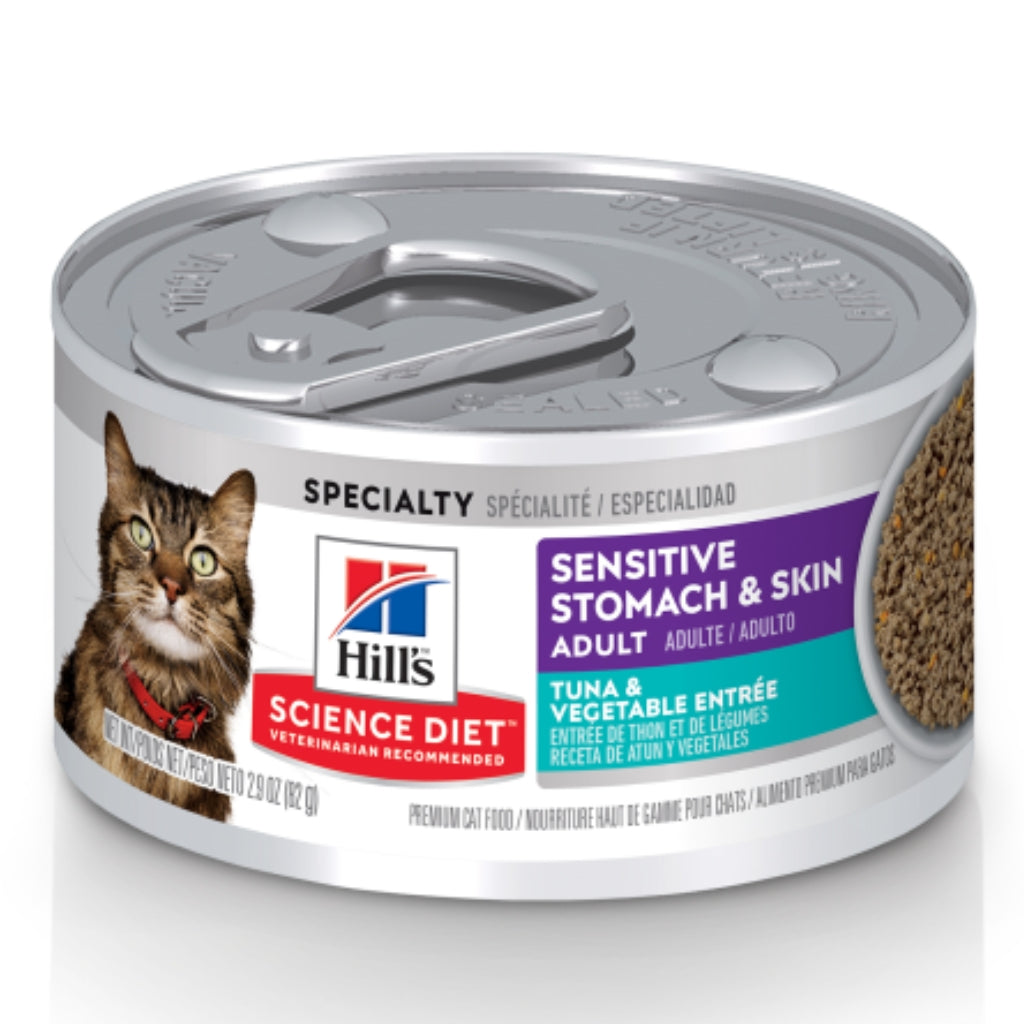 Healthy digestion is a cornerstone of good cat nutrition. That's why Hill's Science Diet Adult Sensitive Stomach & Skin Tuna & Vegetable Entrée wet food uses easy-to-digest ingredients in a grain-free formula to give your grown cat optimal digestive & skin health. Natural fibers help promote easier stool pickup, while omega-6s and vitamin E nourish your adult cat's skin and add luster to their coat. If you're looking for a cat food without grain, this wet food made with natural ingredients is one to check out!