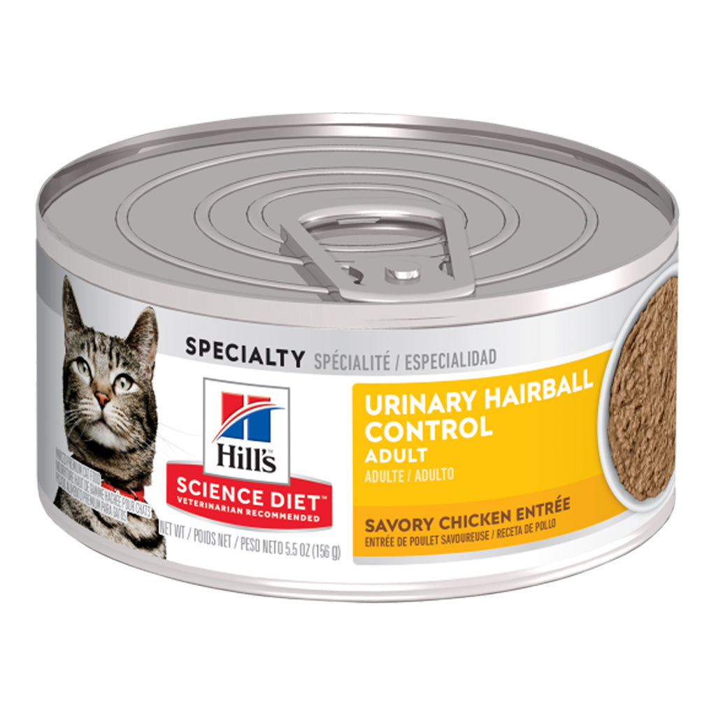 No one likes hairballs - especially your adult cat. That's why Hill's Science Diet Adult Urinary Hairball Control Savory Chicken Entrée wet cat food provides nutrition to help avoid hairball formation for adult cats. This cat food made with natural ingredients uses optimized levels of magnesium to support a grown cat's entire urinary system - from kidneys to bladder - while easily digestible natural fibers comfortably reduce hairball issues. Real chicken gives your cat quality protein for muscle maintenance while omega-3 and omega-6 fatty acids nourish the skin and fur.