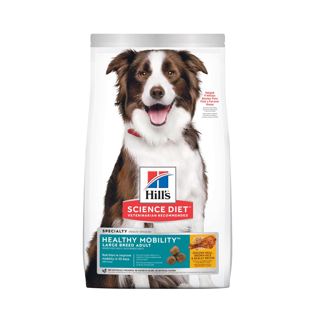 Large-breed dogs can be prone to joint issues. Hill's Science Diet Healthy Mobility Large Breed dry dog food contains advanced nutrition shown to support healthy joints & improve mobility in 30 days. Using natural sources of glucosamine & chondroitin – the building blocks of healthy cartilage – this adult dog food supports the joints, while a balanced set of minerals promote strong bones. High-quality protein & natural fibers keep your large dog satisfied between meals. Made with natural ingredients, it contains omega-6 fatty acids and vitamin E to nourish the skin and help keep a shiny coat.