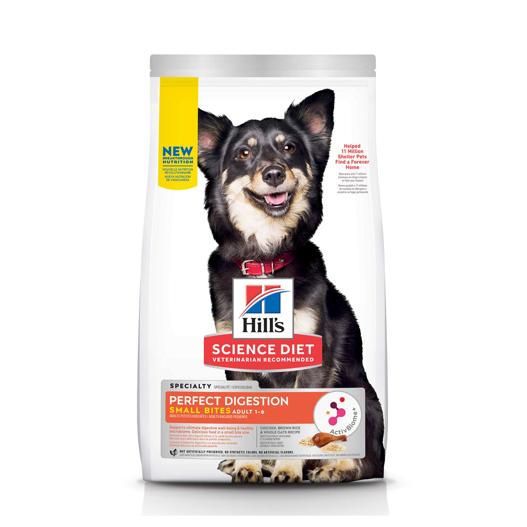 Every dog has an entire ecosystem living within them - the gut microbiome, full of billions of diverse microbes unique to your pet. With the right nutrients to help balance their microbiome, you can actually affect not only their digestive health, but their overall well-being. That's why we developed Hill's Science Diet Perfect Digestion small bites dog food with our ActivBiome+ Technology ingredient blend of prebiotics. It's a breakthrough nutrition that supports each dog's unique gut microbiome for healthy digestion and balanced nutrition that helps your dog feel their best.