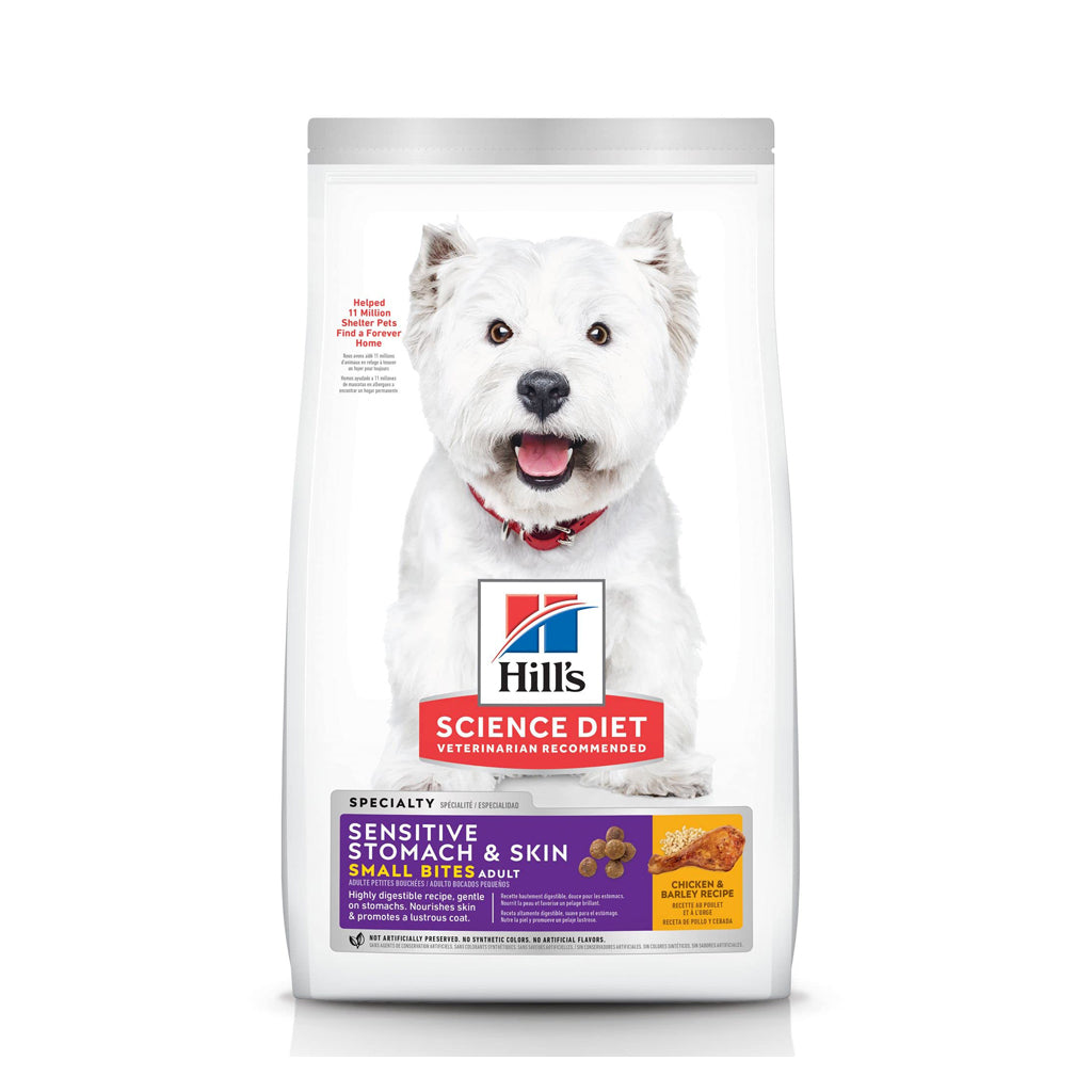Hill's Science Diet Sensitive Stomach & Skin Small Bites dry dog food provides optimal digestive health while nourishing skin & promoting a lustrous coat. Prebiotic fiber fuels beneficial gut bacteria and supports a balanced microbiome. Its high digestibility allows for optimal nutrient absorption and easier stool pick-up. Vitamin E and Omega-6 fatty acids provide skin nourishment.
