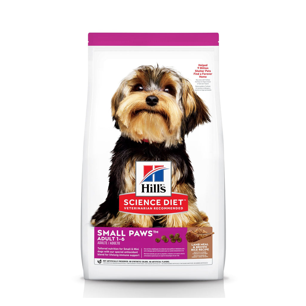 Little dogs have their own needs when it comes to mealtime, so give them a pet food that's big on love, and small in size. Hill's Science Diet Small Paws adult dry dog food is tailored nutrition for the unique needs of small & mini dogs during the prime of their life. This nibble-size kibble has delicious lamb flavor for those that prefer variety. Made with natural ingredients, it contains omega-6s and vitamin E to nourish coat and skin. Balanced levels of high-quality protein help maintain lean muscle, while the proprietary antioxidant blend supports the immune system for lifelong health.