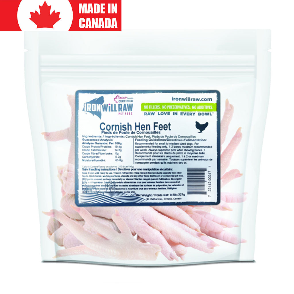 Cornish Hen Feet are a great addition and can be fed as part of a meal for large breed dogs or as a meal replacement for smaller dogs and cats. Not only are they a natural source of glucosamine, they also help maintain clean teeth and gums and are also a great source of entertainment and enrichment.