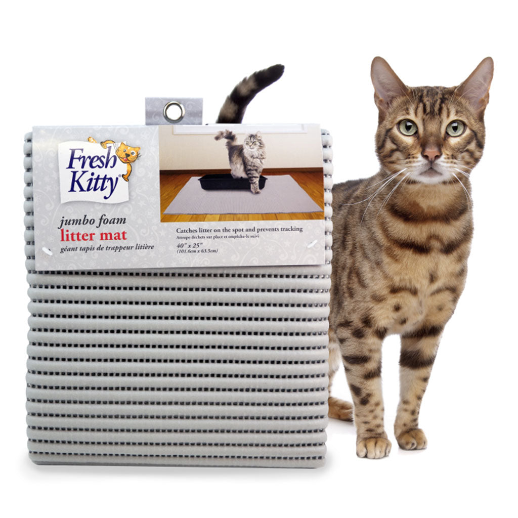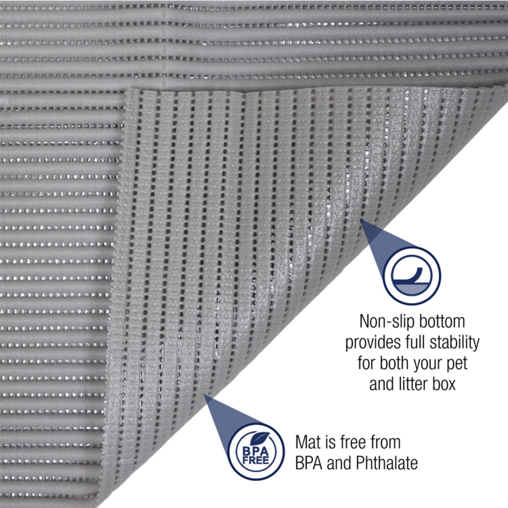 Our technologically advanced jumbo foam litter mat features deep grooves to capture excess litter that your cat so easily scatters around the house. Measuring 40" x 25" our jumbo-sized mat covers more surface area surrounding the litter box so that means the stays on the mat and not on your floors. The non-slip bottom provides full stability that keeps your litter mat in one place. Â Our Foam litter mat is BPA and phthalate-free and our innovative foam material is gentle on sensitive paws but strong enough to endure accidental scratches. This mat is even machine washable to keep it clean with no hassle.