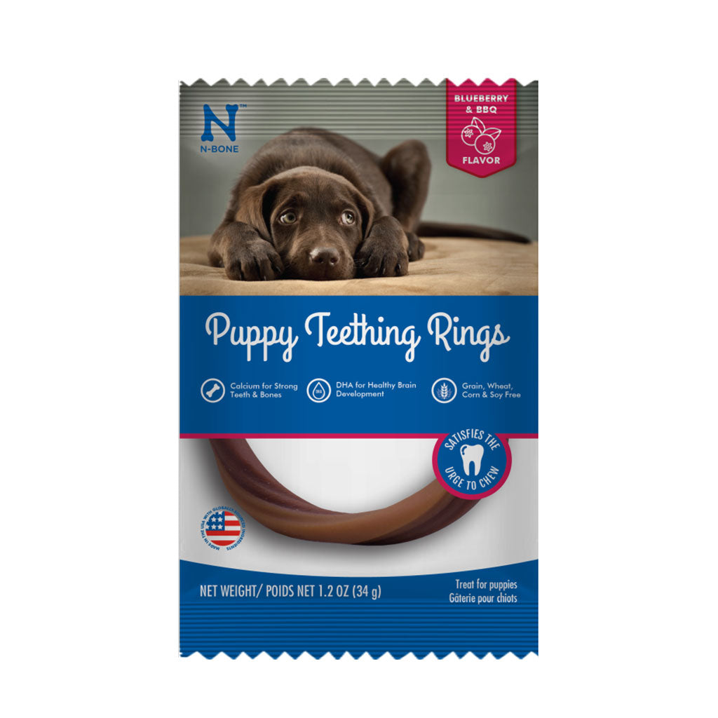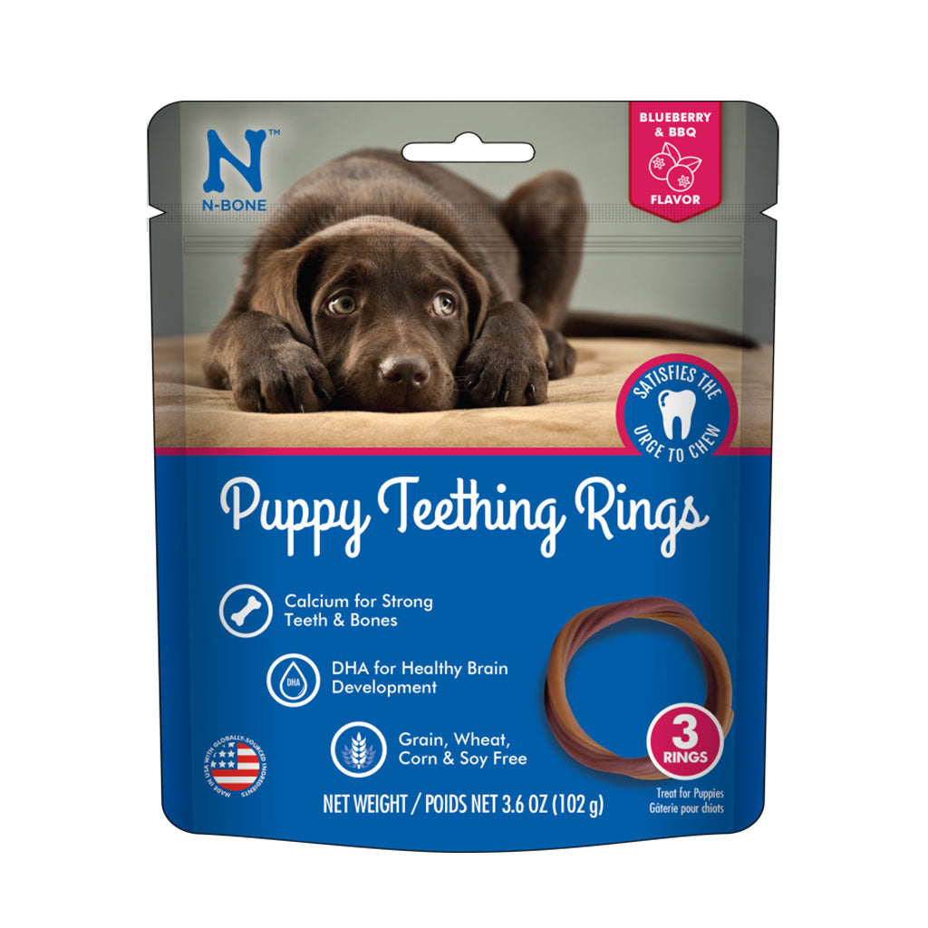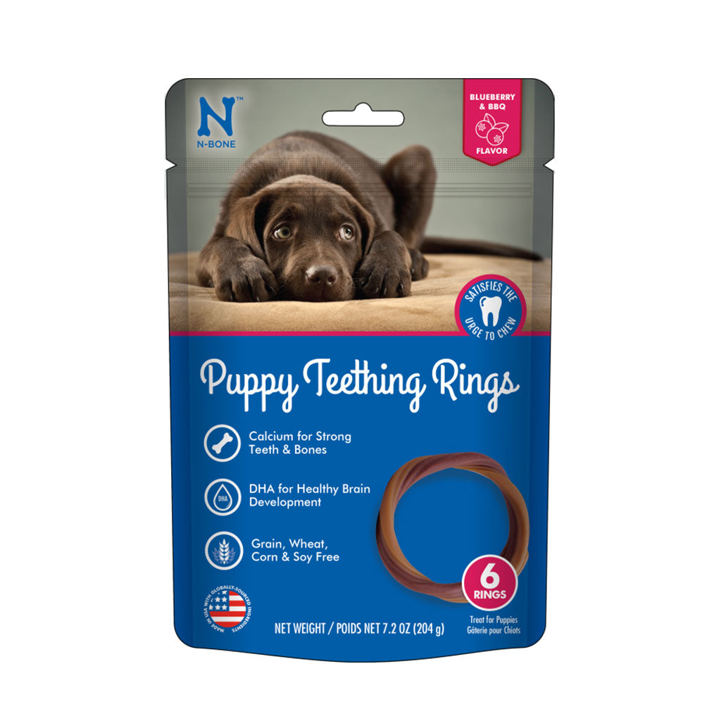 N-Bone® Puppy Teething Rings Grain-Free are easy for floppy puppy paws to hold onto and provide a soothing and appropriate outlet for chewing. Formulated with DHA and calcium to support your puppy’s unique nutritional needs, our delicious grain-free blueberry & bbq flavored rings are pliable and won’t damage immature teeth or upset tummies that have gluten sensitivity.