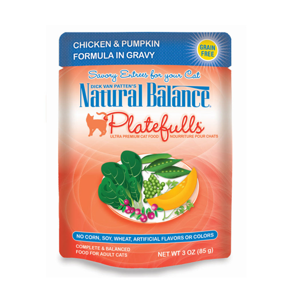 This savory grain-free entrée features high-quality chicken and pumpkin mixed with wholesome vegetables and fruit including peas, sweet potatoes, cranberries, and more. Served in a tasty gravy, this platefull of goodness has complete & balanced nutrition for all breeds of adult cats. Your cat will love to lap up and devour the delicious meal inside our Platefulls® Chicken & Pumpkin Formula in Gravy Cat Pouch!