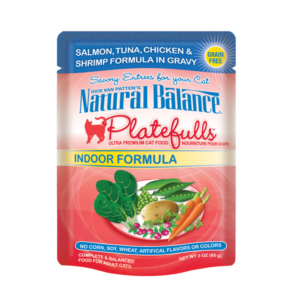 This savory entrée features premium salmon, tuna, chicken and shrimp mixed with vegetables and fruit including peas, carrots, potatoes, and cranberries. Scientifically designed to support the needs of adult indoor cats, this grain-free diet is also served in a tasty gravy. Your cat will love to lap up and devour the delicious meal inside our Platefulls® Indoor Salmon, Tuna, Chicken & Shrimp Formula in Gravy Cat Pouch!
