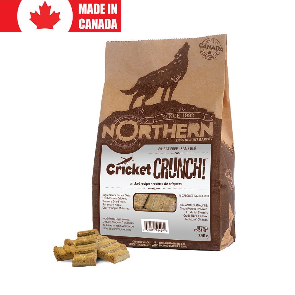Chirp chirp! Easy on the tummy and planet, this Northern Biscuit recipe is baked with Canadian raised fresh frozen crickets, a sustainable protein rich in nutrients like iron, B12 and all 9 essential amino acids, to provide dogs with a delicious crunchy biscuit that is easily digestible and sustainable. Baked in small batches with limited ingredients and the specially crafted Northern CRUNCH™, Northern biscuits are naturally preserved and packaged in a 100% compostable bag. At only 16 calories per 5g biscuit, these biscuits are perfect for treating, rewarding and bonding with your dog.